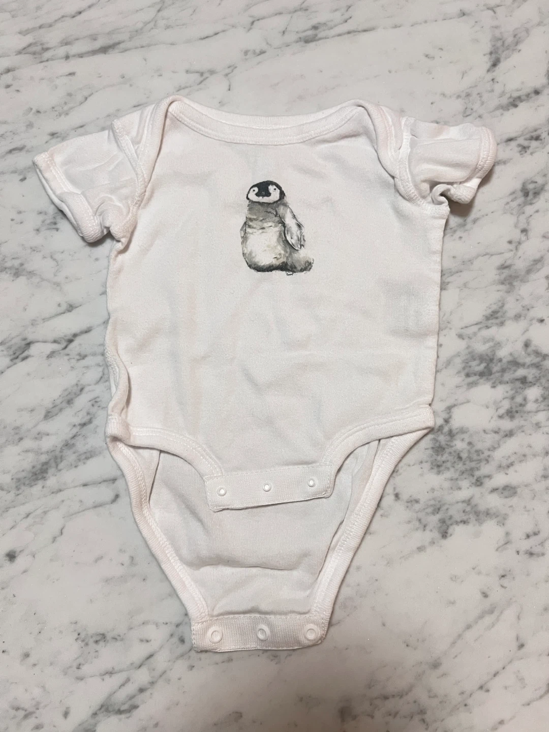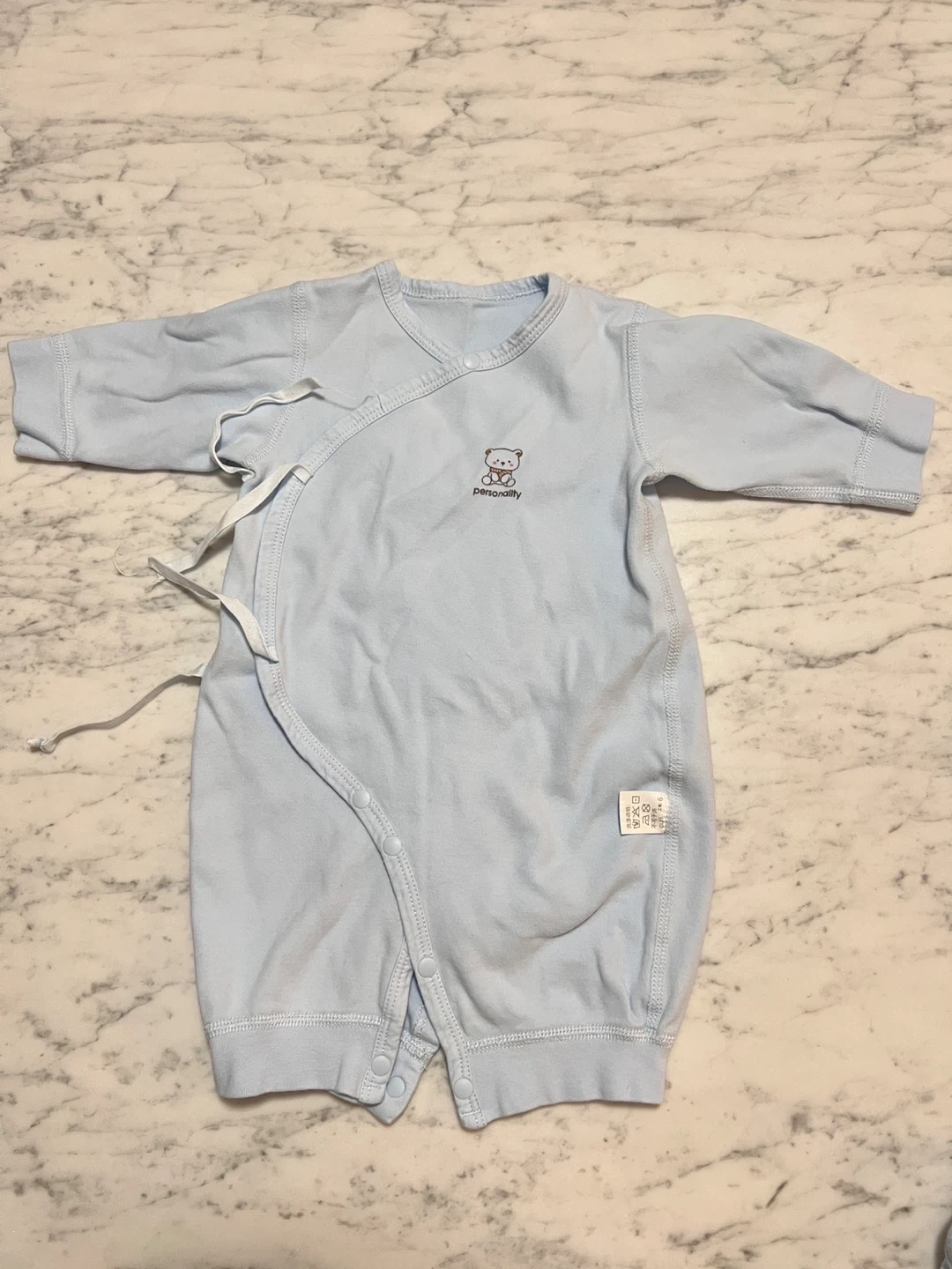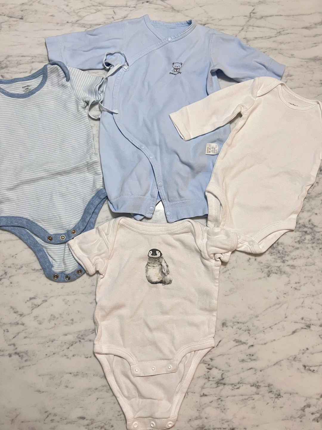 Bundle includes 4 pieces of baby clothing: a blue long-sleeve sleeper with a teddy bear, a white long-sleeve onesie, a white short-sleeve onesie, and a blue and white striped short-sleeve onesie. Made of soft cotton material. 0-6months.