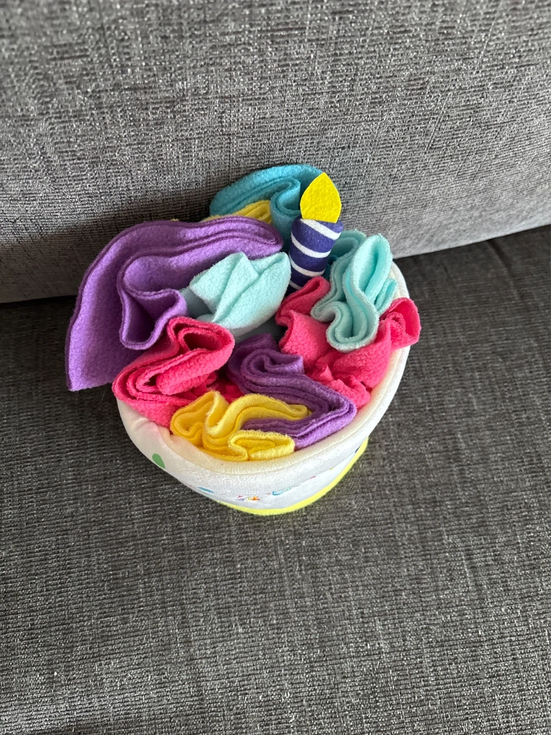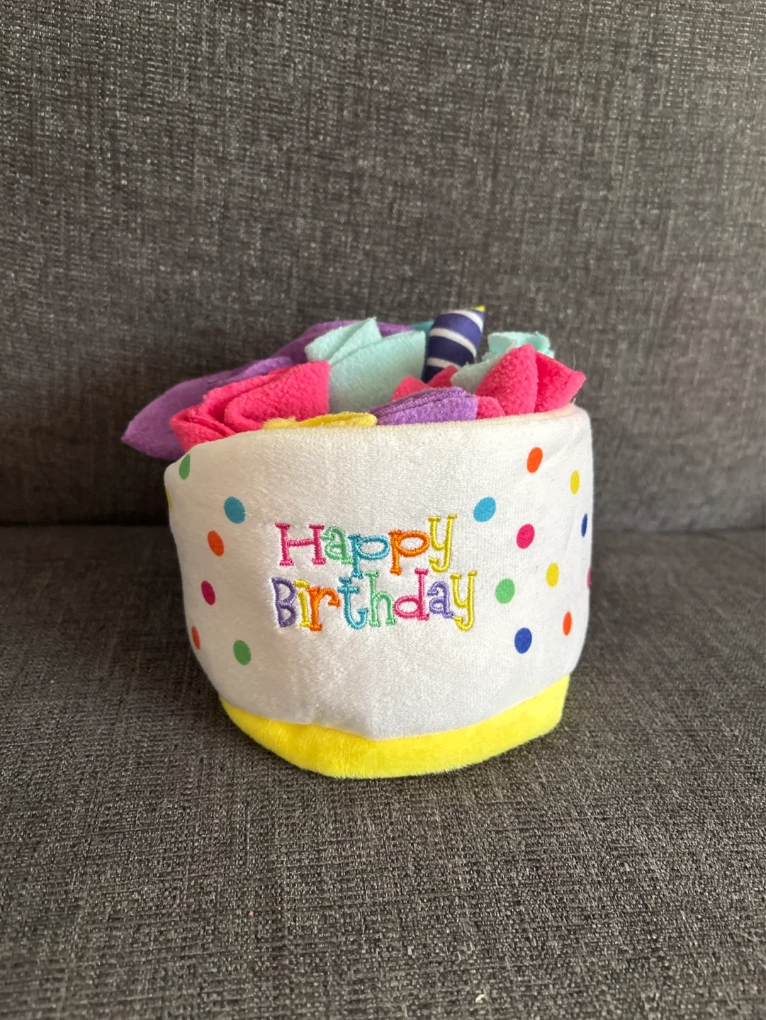 This pet plush cake toy features a "Happy Birthday" embroidered on the side with colourful polka dots. It's stuffed with soft, bright fabric layers to hide treats and has a candle on top. Perfect for your pet to play with during birthday celebrations!