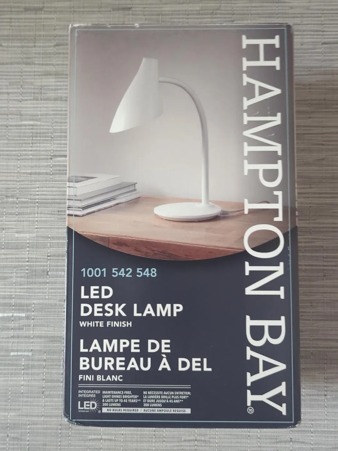 This is a Hampton Bay LED desk lamp with a white finish. It's integrated and maintenance-free, shining brighter and lasting up to 45 years. It provides 300 lumens and requires no bulbs.
