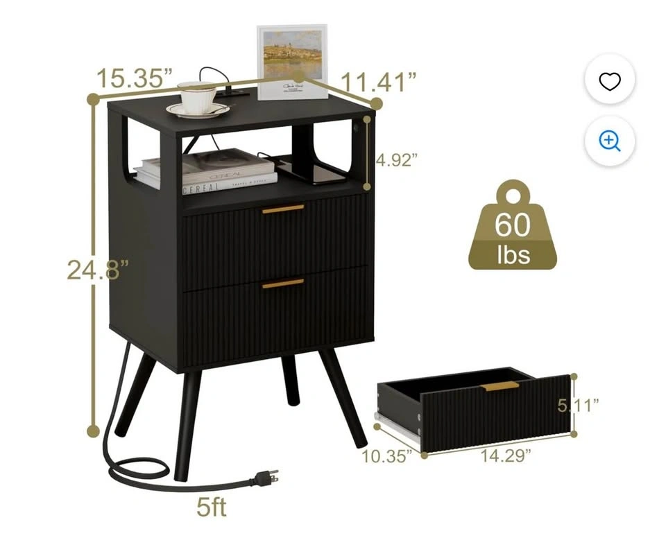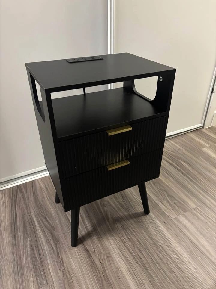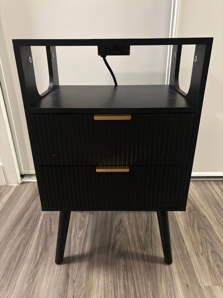 Brand new nightstand with charging station and LED lights. Modern bedside table with 2 storage drawers and an open wood shelf, perfect for bedrooms and small spaces. Features solid wood legs.