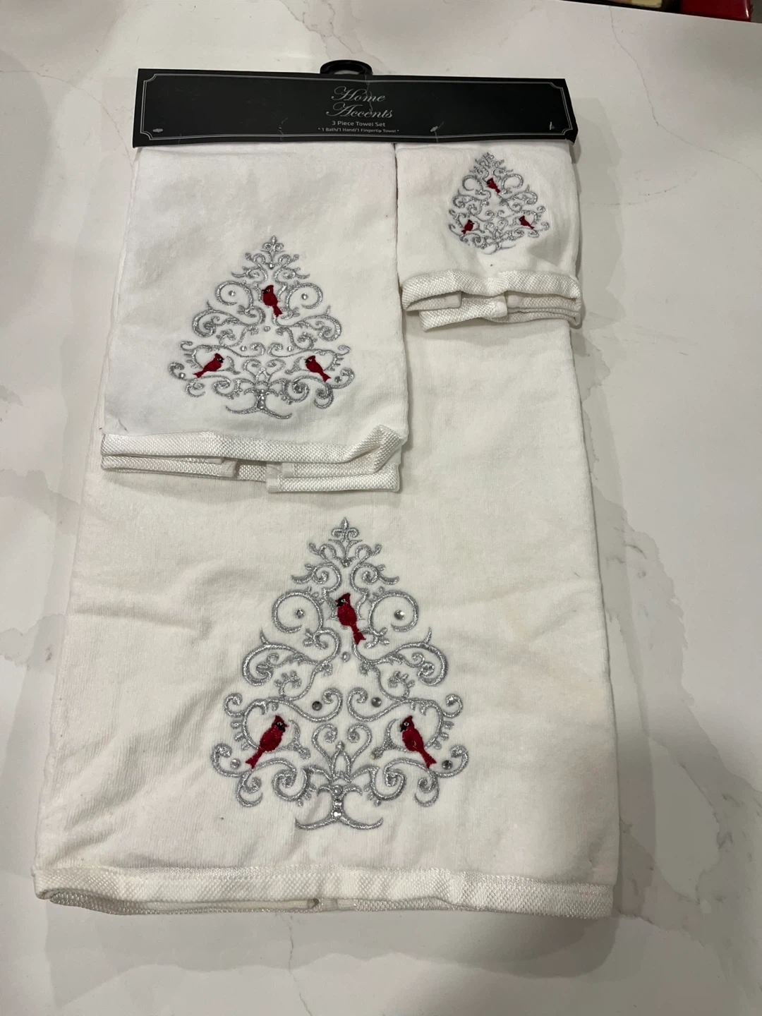 I'm selling a brand new Home Accents 3-piece towel set! The set includes one bath towel, one hand towel, and one fingertip towel. They feature a lovely embroidered design. Made with 100% cotton.