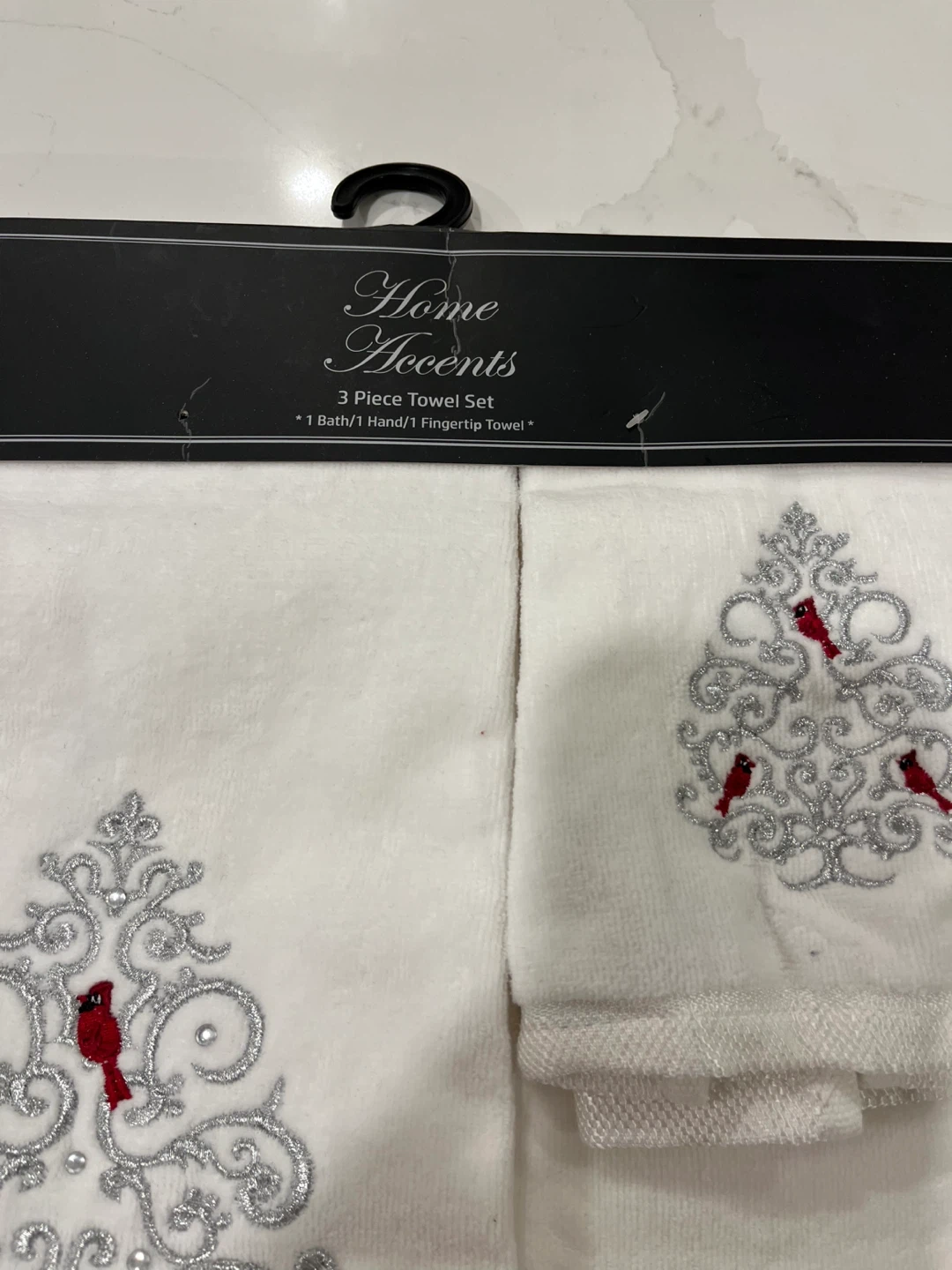 I'm selling a brand new Home Accents 3-piece towel set! The set includes one bath towel, one hand towel, and one fingertip towel. They feature a lovely embroidered design. Made with 100% cotton.