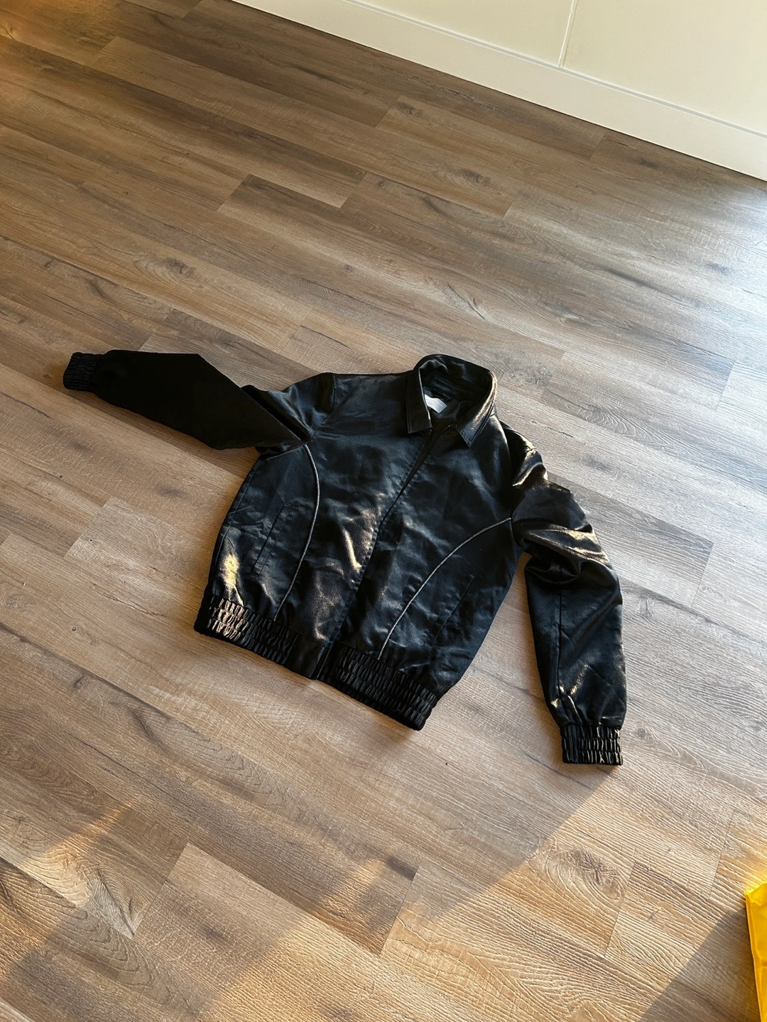 Men’s black satin bomber jacket. Zip-up front. Elasticated cuffs and hem. Size M. Subtle silver piping detail.