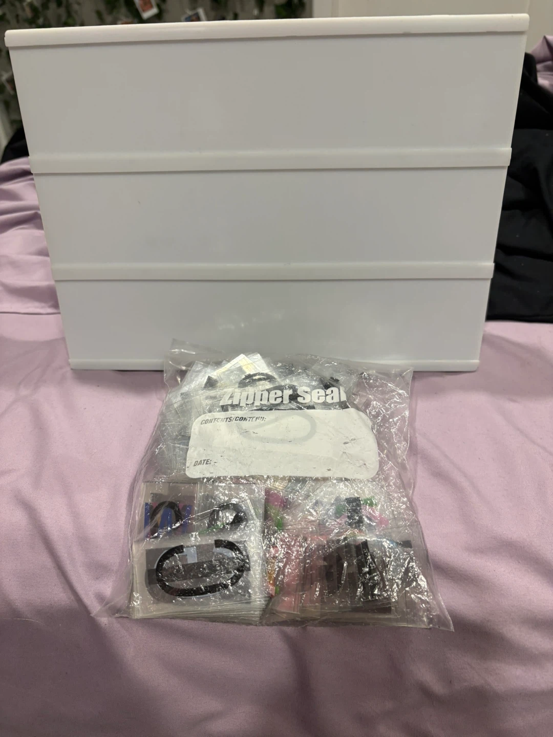 White LED light box. Comes with assorted accessories in a sealed bag. Battery compartment is clean and empty. This box is great for displaying messages or creating a custom vibe!