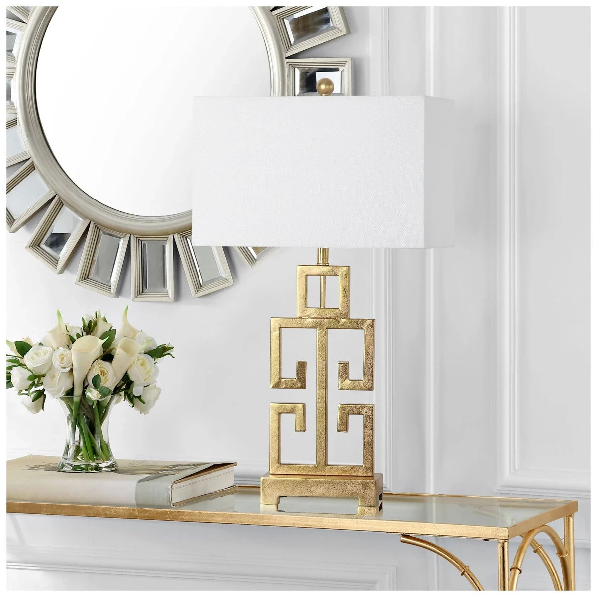 A stylish pair of table lamps with a gold finish and a distinctive Greek key design on the base. They're topped with white rectangular shades. Lamp height is 28.75 inches. These lamps add a touch of elegance to any room!