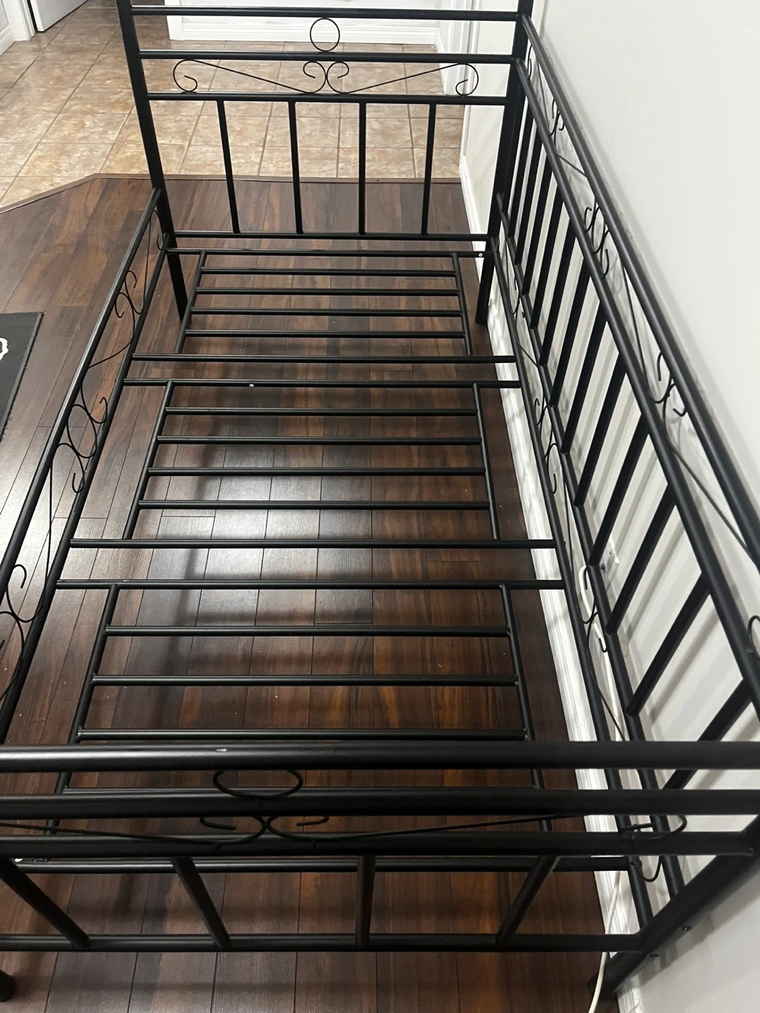 Black metal daybed frame with decorative scrollwork. Includes a grey and white patterned mattress. Metal construction, twin size.