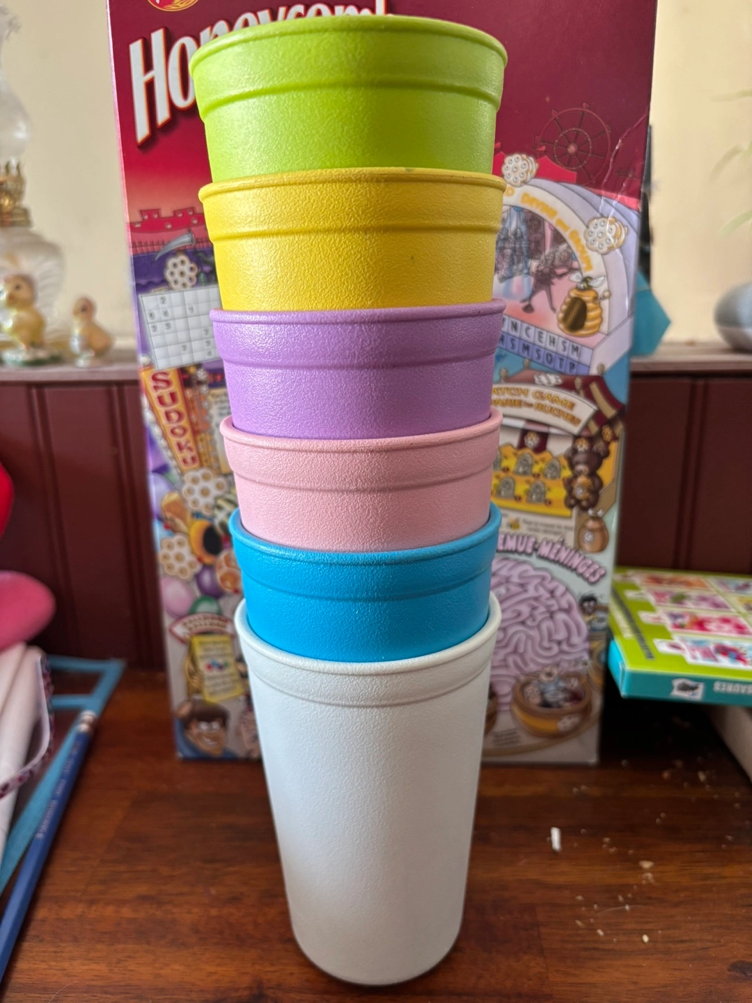 Six pastel-coloured plastic cups. Great for kids or parties. Re-Play brand; made out of recycled milk jugs. Asking $1 each or $5 for the lot.