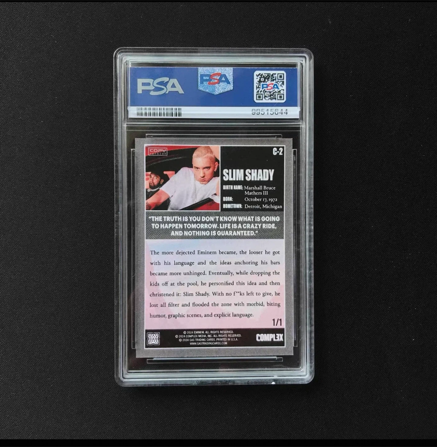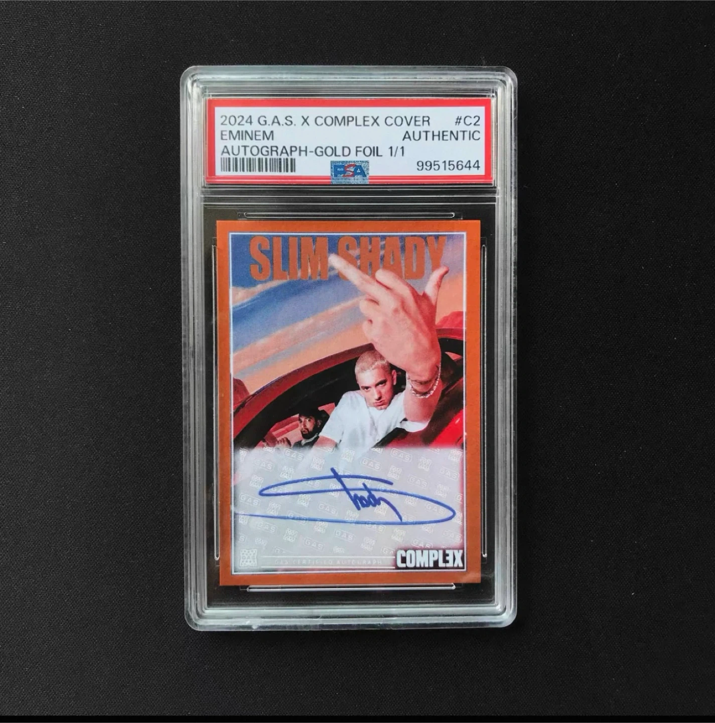 This is a 2024 G.A.S. x Complex Cover trading card featuring Eminem as Slim Shady. It's an autograph-gold foil 1/1 edition, authenticated by PSA. The card includes biographical information and a quote from the artist.