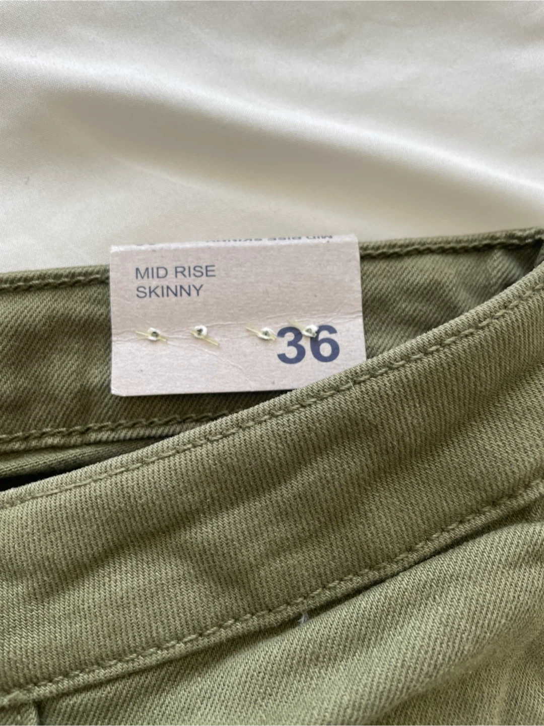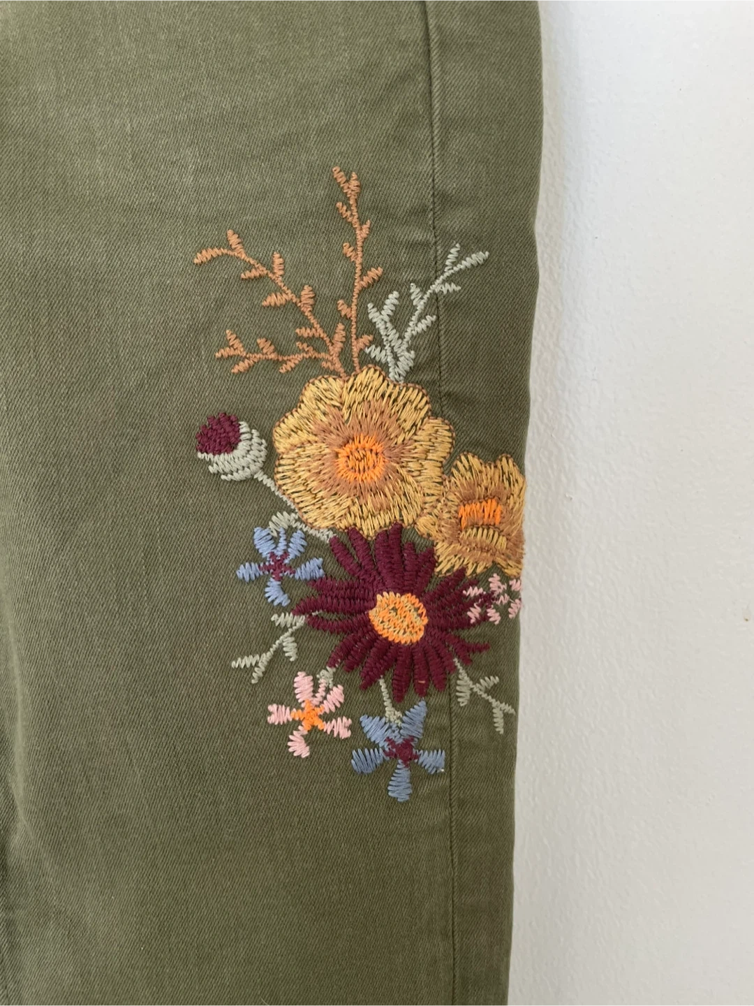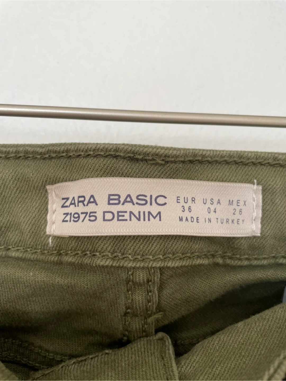 Olive green Zara Basic Z1975 Denim skinny jeans. Features mid-rise waist and embroidered floral details on the leg. Made in Turkey. Size 36. These jeans offer a stylish and comfortable fit.
