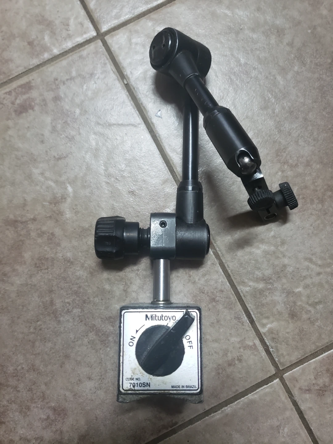This is a Mitutoyo magnetic stand. It has an adjustable arm with a dial indicator holder. The base has an on/off switch for magnetic adhesion. Made in Brazil.