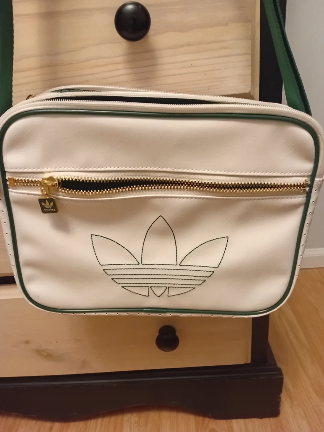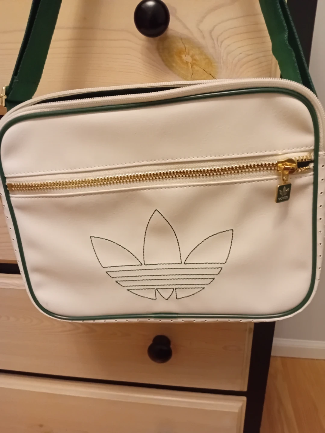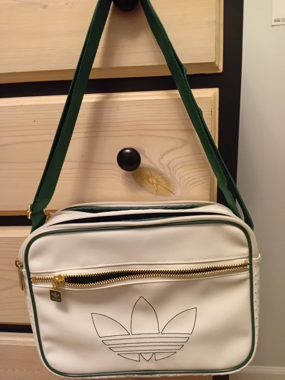 Selling a stylish Adidas crossbody bag in white with green accents! It's in great condition and perfect for everyday use. Features the classic Adidas logo and a convenient size for carrying your essentials