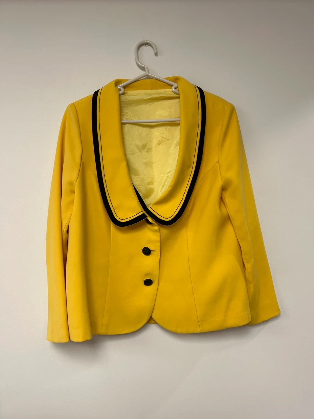 This is a bright yellow blazer with a black trim around the collar and lapels. It features two black buttons for closure. The jacket's lining is a bright yellow satin. It's a stylish piece for any wardrobe!