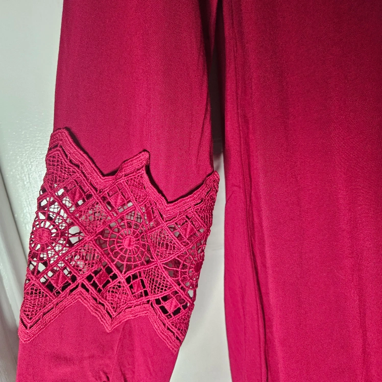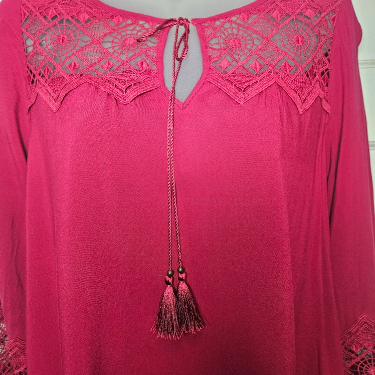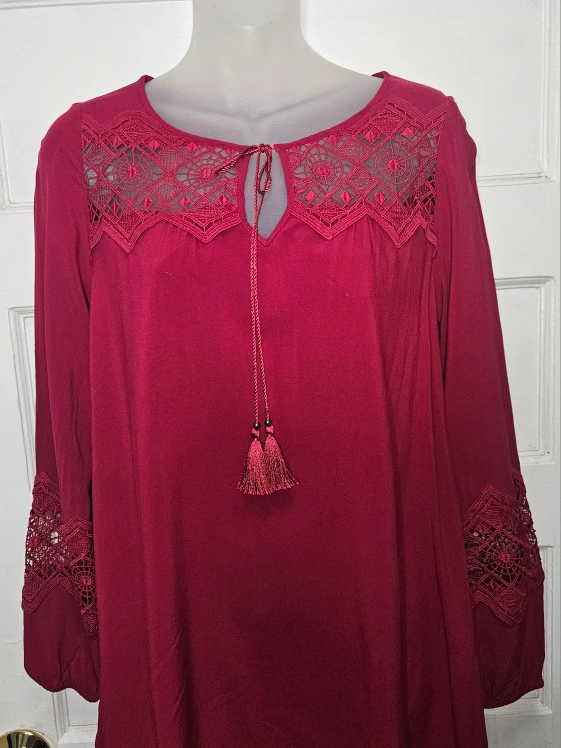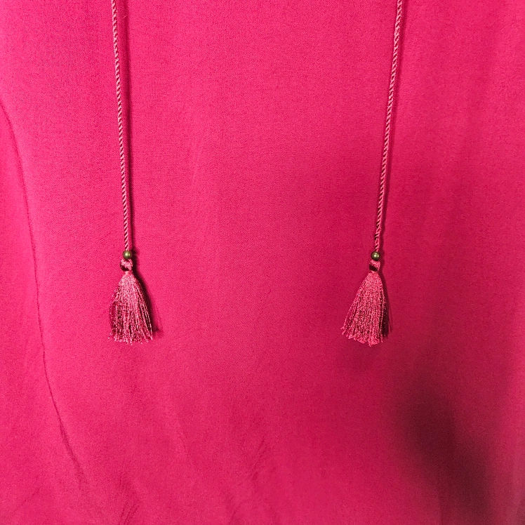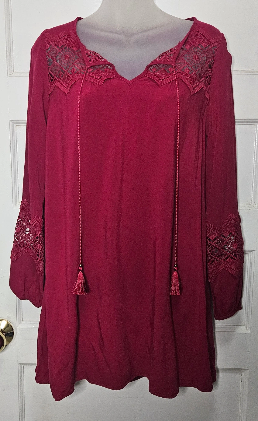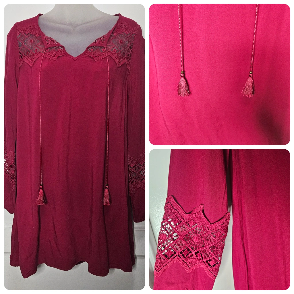 Express shift dress with beautiful embroidery over the chest and a band of it across the forearms. Boho tie tassels that I tied, and the other time I wore it, I had it open. The boobs by than needed more room.