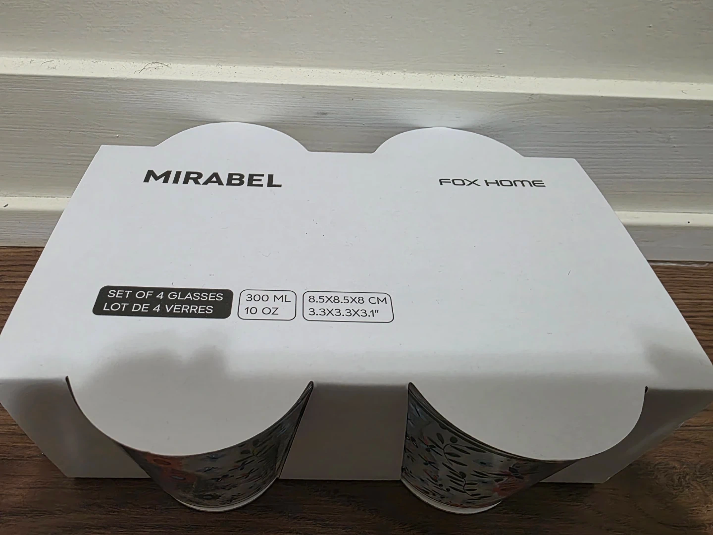 Set of 4 Mirabel glasses from Fox Home. Each glass holds 300 ML (10 OZ). Dimensions are 8.5x5x8 CM (3.3x3.3x3.1"). These glasses have a lovely floral pattern.