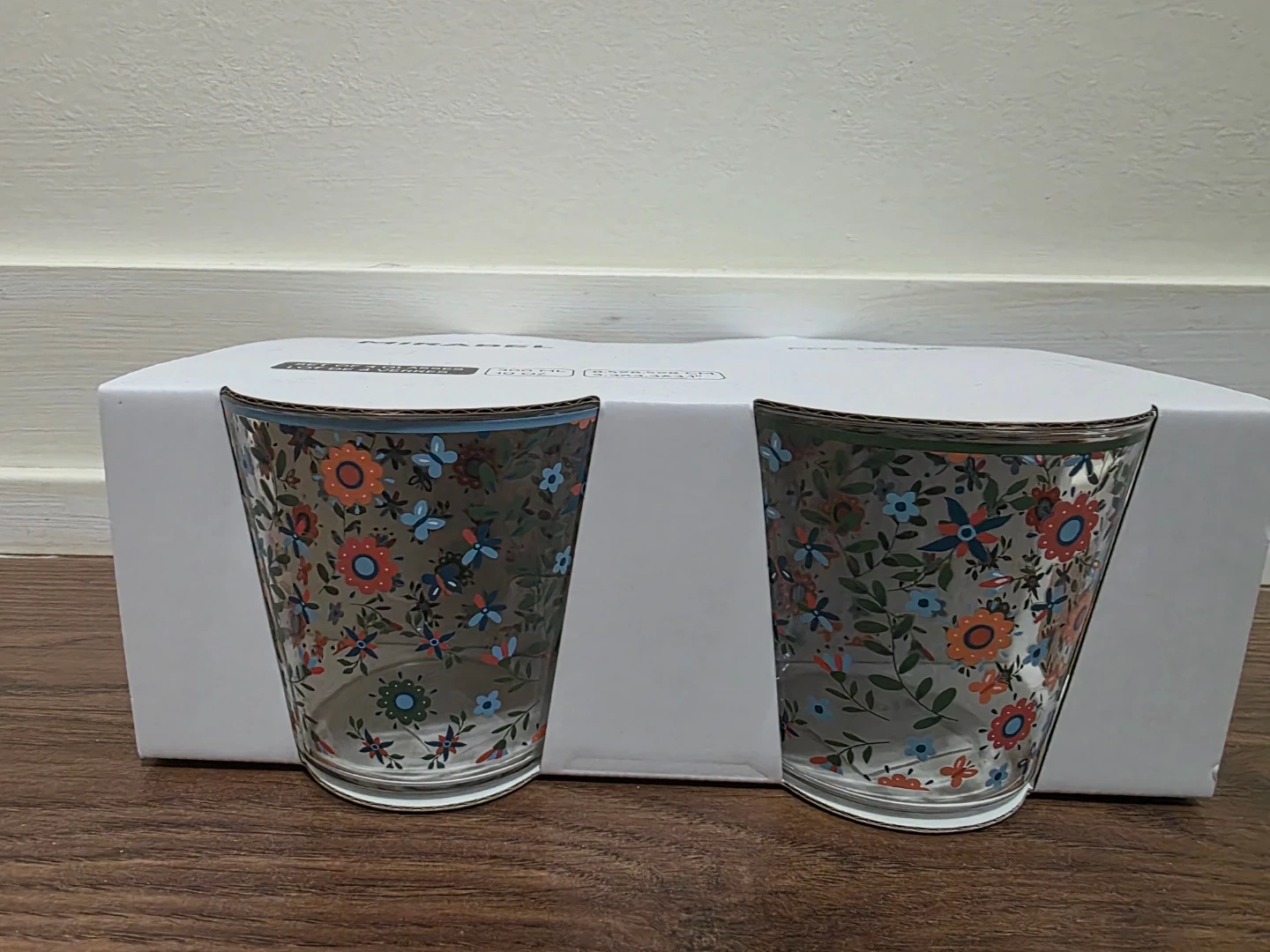Set of 4 Mirabel glasses from Fox Home. Each glass holds 300 ML (10 OZ). Dimensions are 8.5x5x8 CM (3.3x3.3x3.1"). These glasses have a lovely floral pattern.