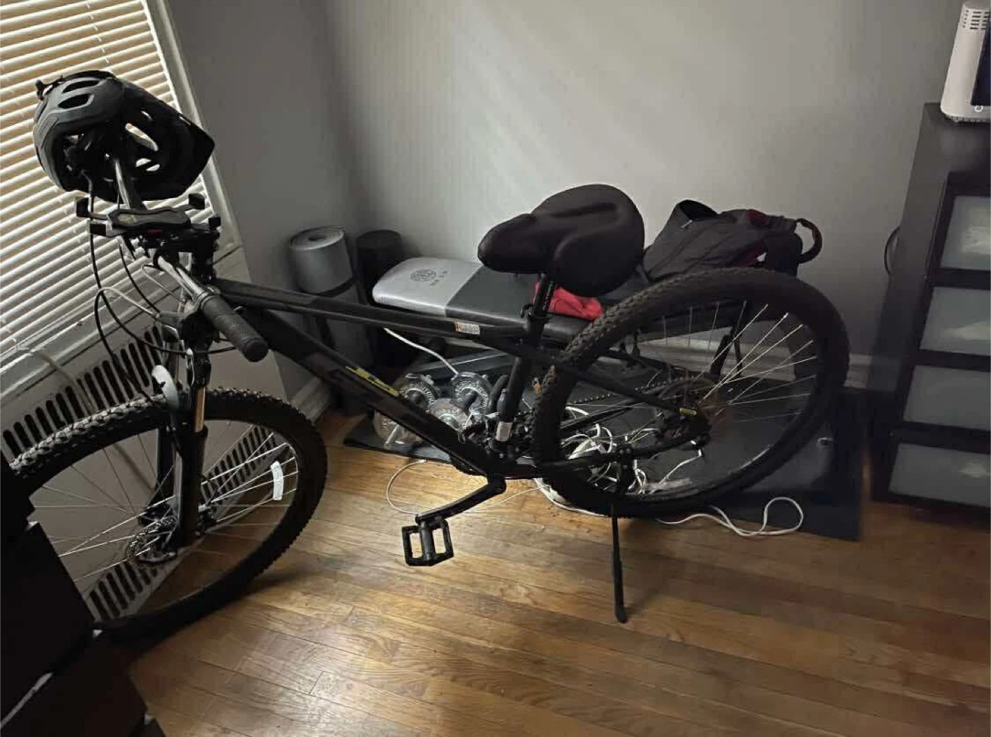 Comes with a heavy-duty floor pump (with pressure gauge), vertical bike stand, adjustable phone mount, padded seat cover, and helmet.