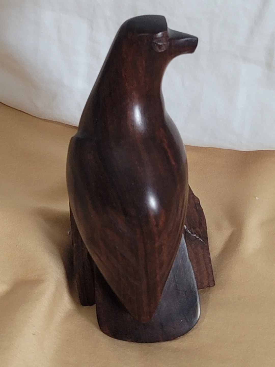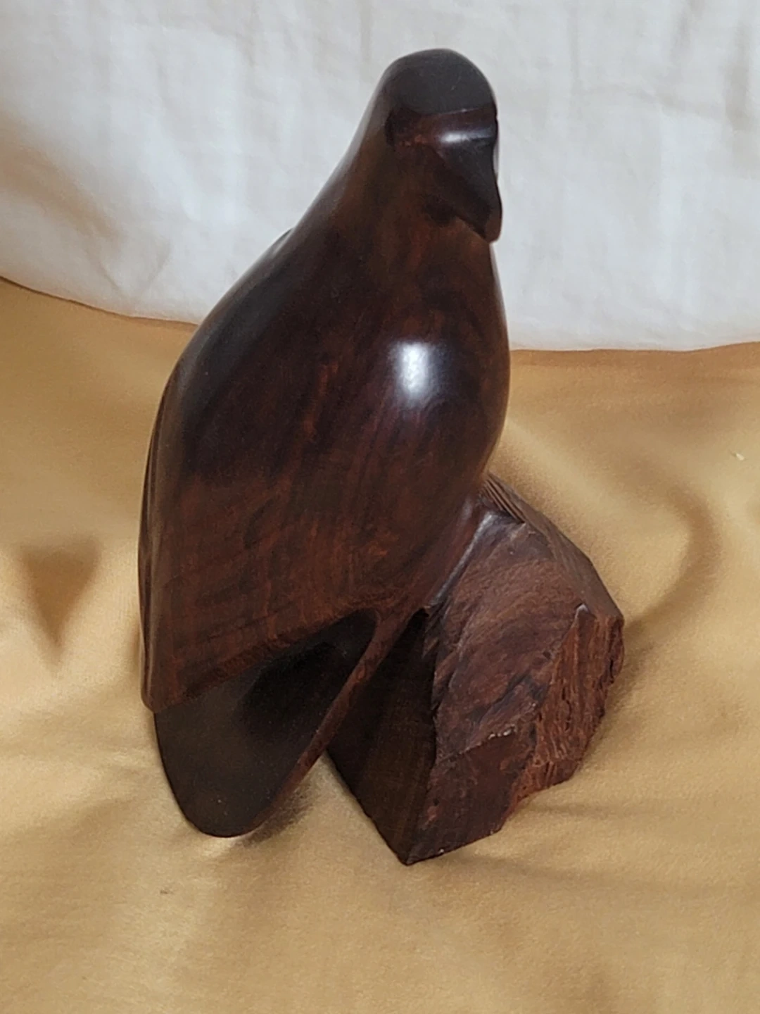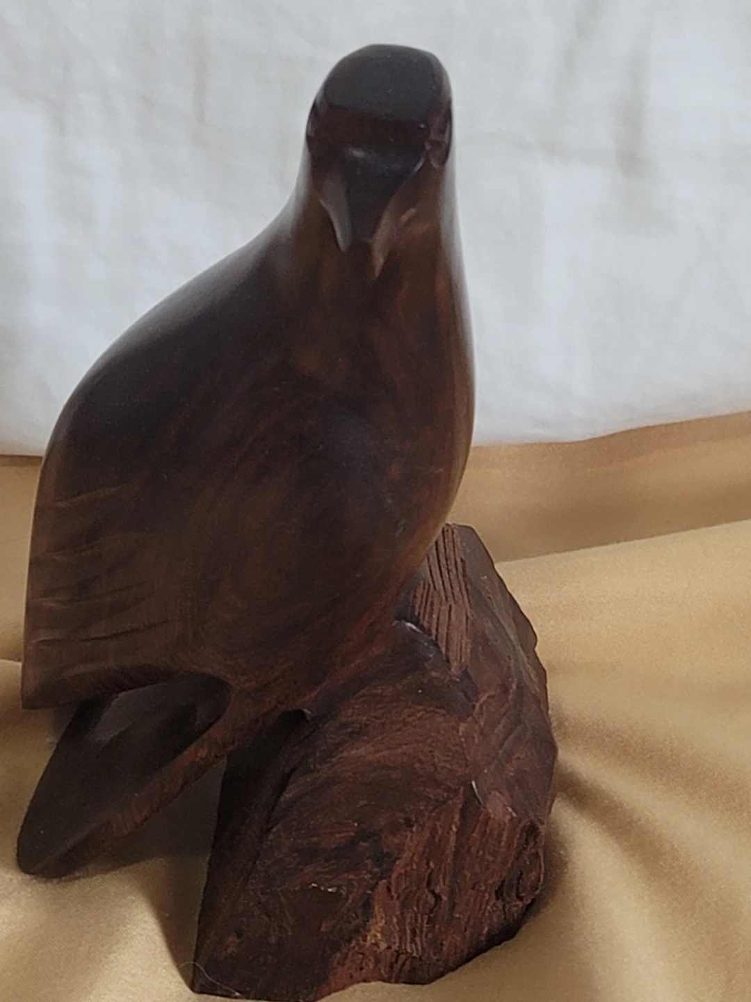 This is a carved ironwooden bird figurine. It's made from dark wood The detailed carving gives it a realistic appearance.