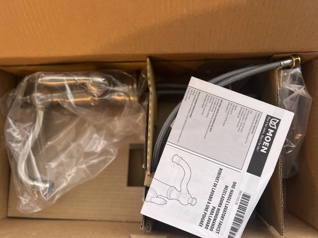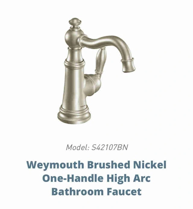 Selling a brand new Moen Weymouth S42107BN brushed nickel basin faucet. It features a high-arc spout and an elegant design, perfect for updating your bathroom. This faucet is still in its original packaging.