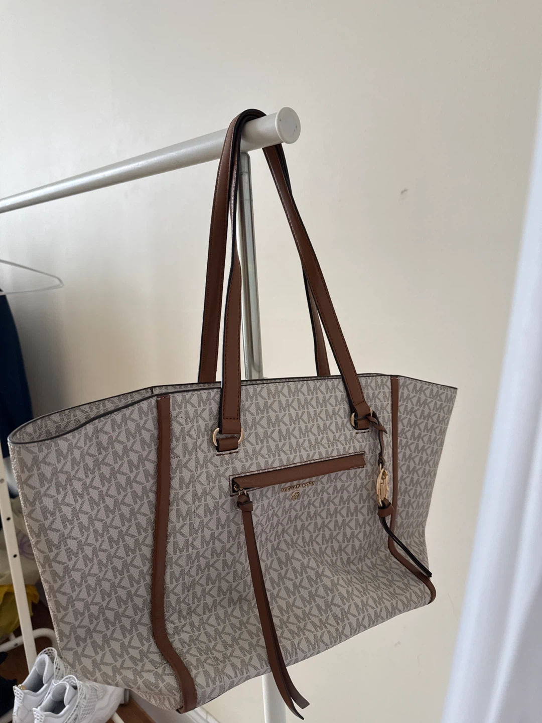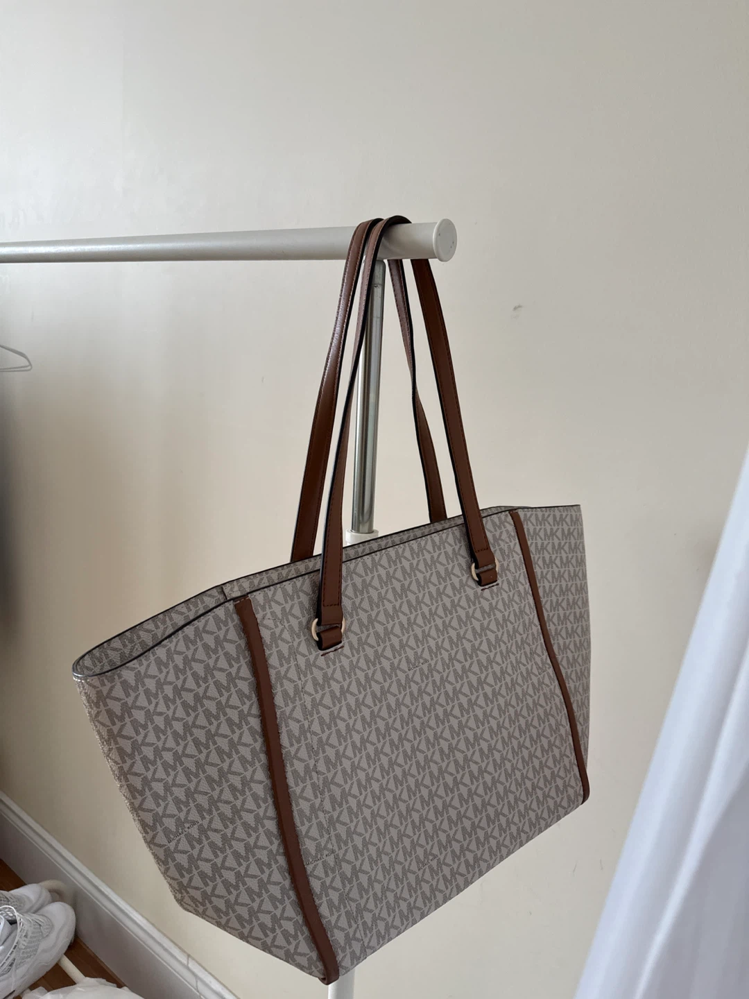 Michael Kors tote bag with signature logo print. Features brown leather trim and handles. It's a spacious bag with an exterior zippered pocket. This would be great for everyday use!