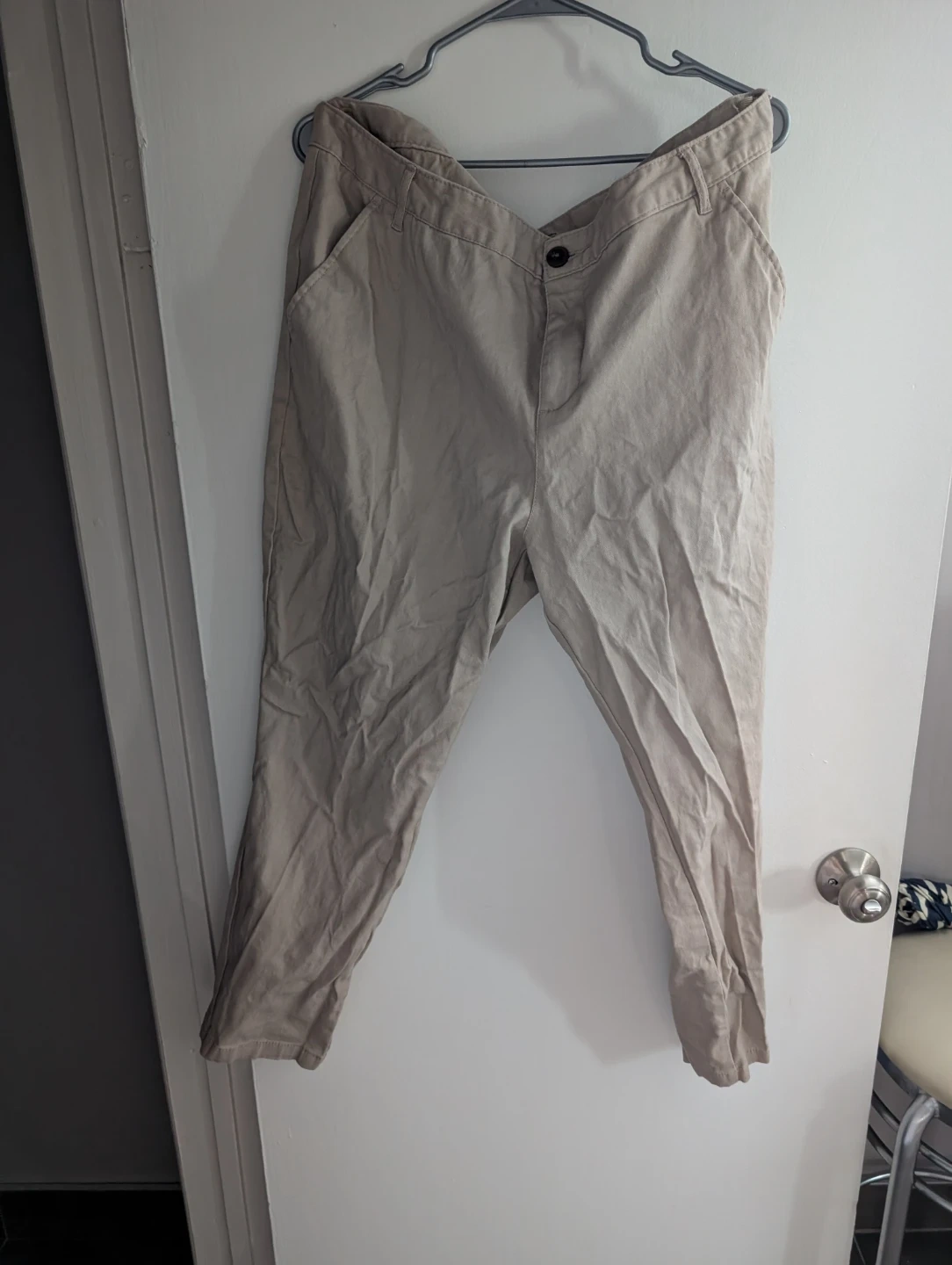 Classic beige chinos. These pants are made of a cotton blend. They feature a straight leg cut and a button and zip closure. Marca Old navy