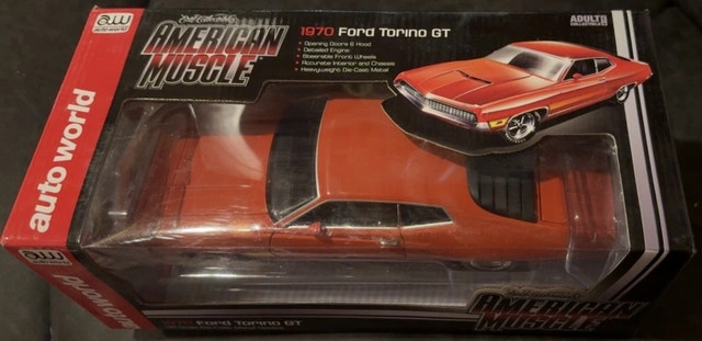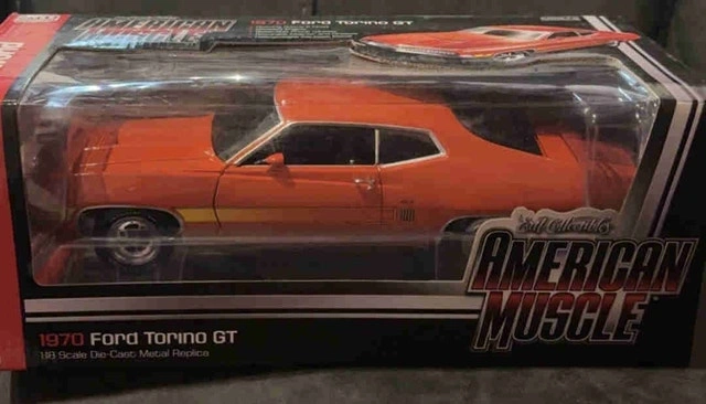 This is an American Muscle 1970 Ford Torino GT, a 1:18 scale die-cast metal replica, still in its original packaging. A fantastic addition to any die-cast car collection, this Torino is looking for a new garage to call home. While it's been admired from afar, it's time for someone else to enjoy this classic piece of Americana. Specifications: * Scale: 1:18 * Material: Die-cast Metal * Model: 1970 Ford Torino GT * Brand: American Muscle. If the ad is still up, the Torino is ready to roll out!