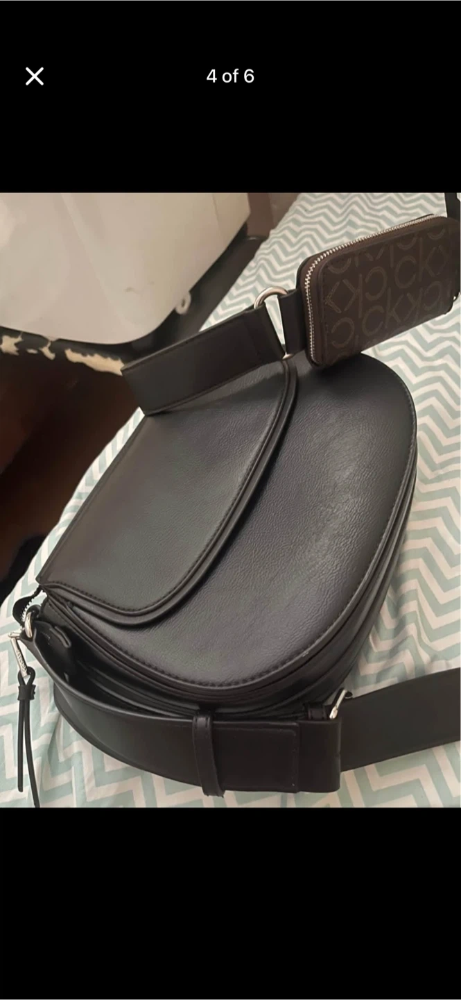 Black faux leather shoulder bag from Calvin Klein. It features a zip closure and a front flap. Includes a detachable logo print coin pouch. Material is faux leather.