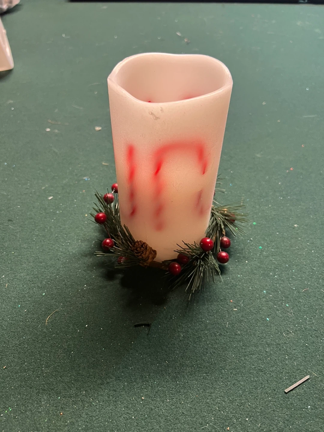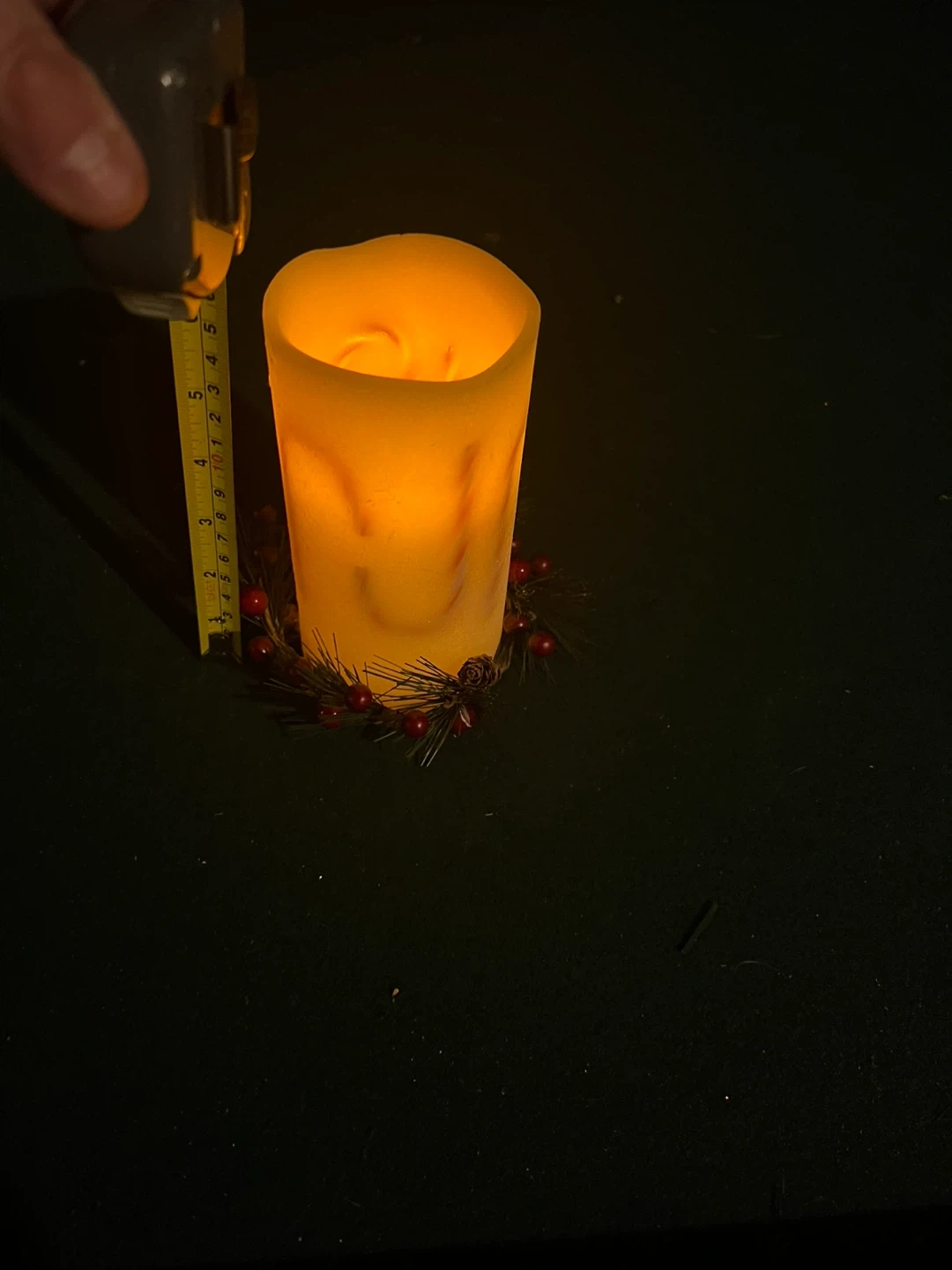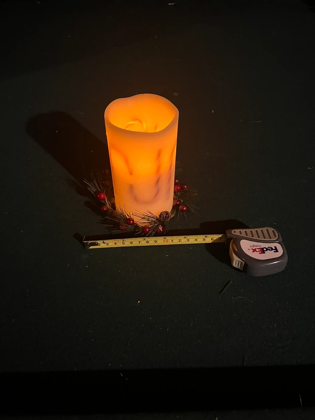 This flameless LED candle features a decorative festive wreath around its base. It has a soft glow, mimicking a real candle without the fire hazard. It stands about 6 inches tall. Perfect for holiday decor! In excellent condition see pictures for measurements takes batteries