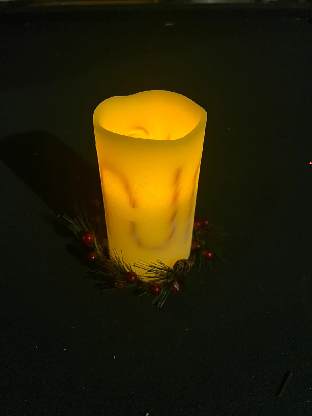 This flameless LED candle features a decorative festive wreath around its base. It has a soft glow, mimicking a real candle without the fire hazard. It stands about 6 inches tall. Perfect for holiday decor! In excellent condition see pictures for measurements takes batteries