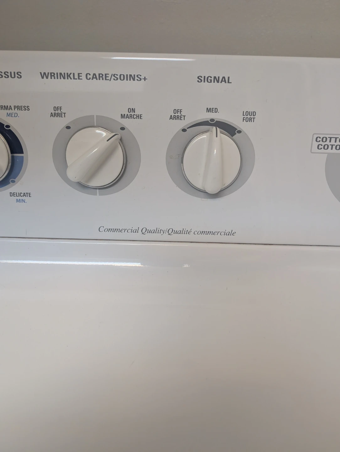 This commercial quality washing machine offers 13 different cycles, including options for Cottons, Delicate, and Perma Press. It features multiple temperature settings and wash options like Quick Wash and Auto Soak. This machine is designed for durability and a range of laundry needs.