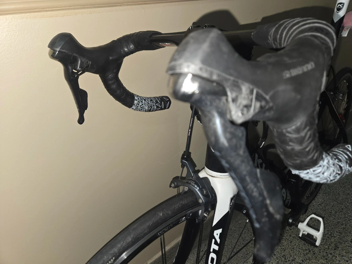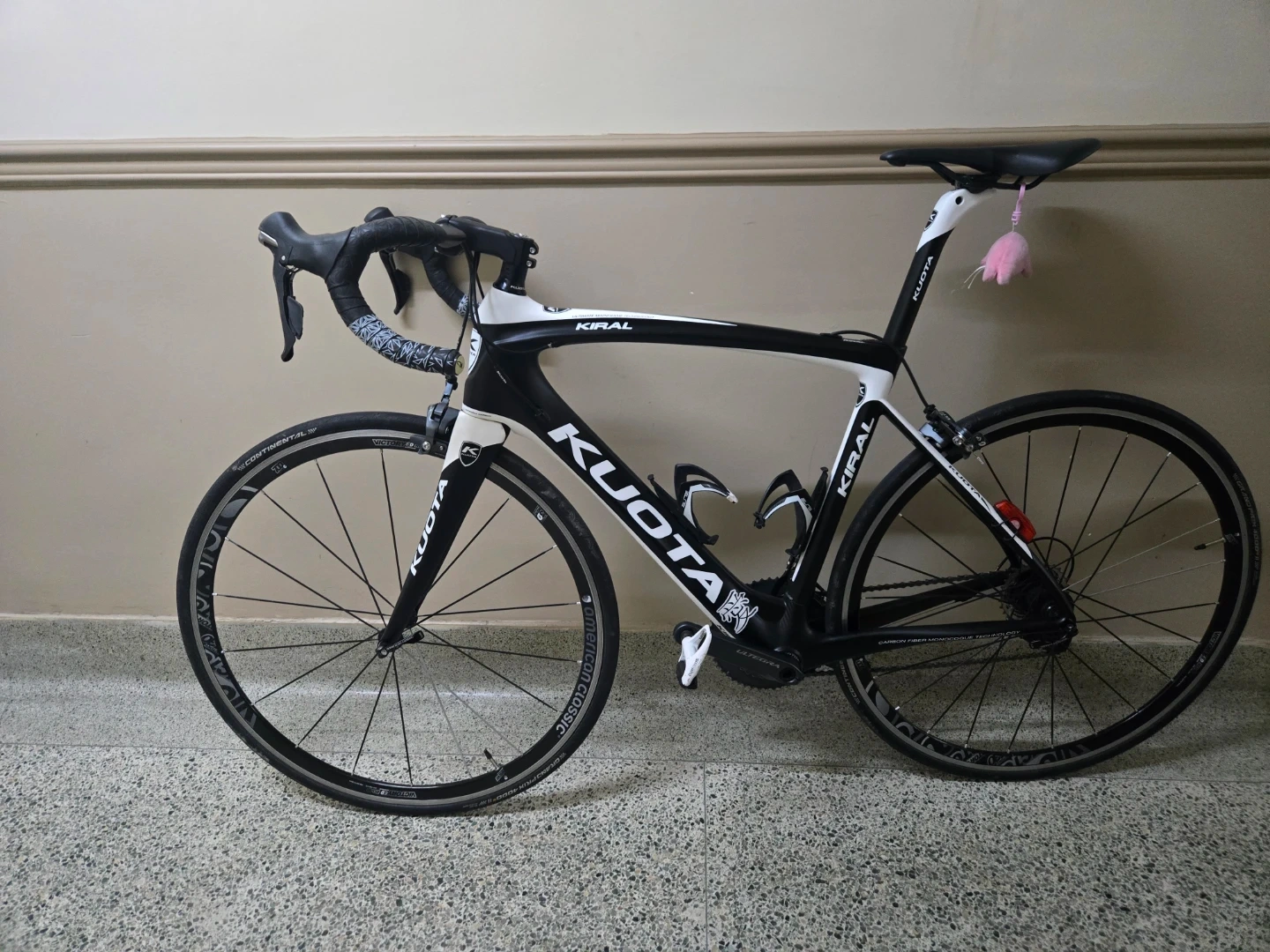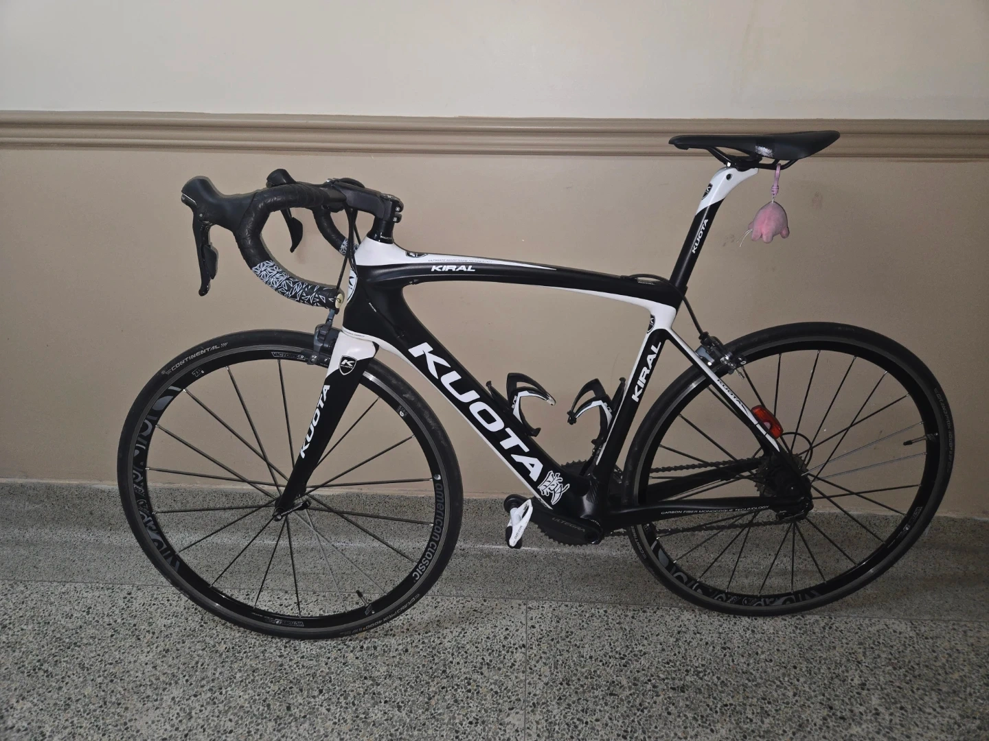 This Kuota Kiral road bike features a lightweight carbon fiber monocoque frame. It's equipped with Ultegra components and Continental tires. This bike is ideal for road cycling enthusiasts looking for performance and speed.