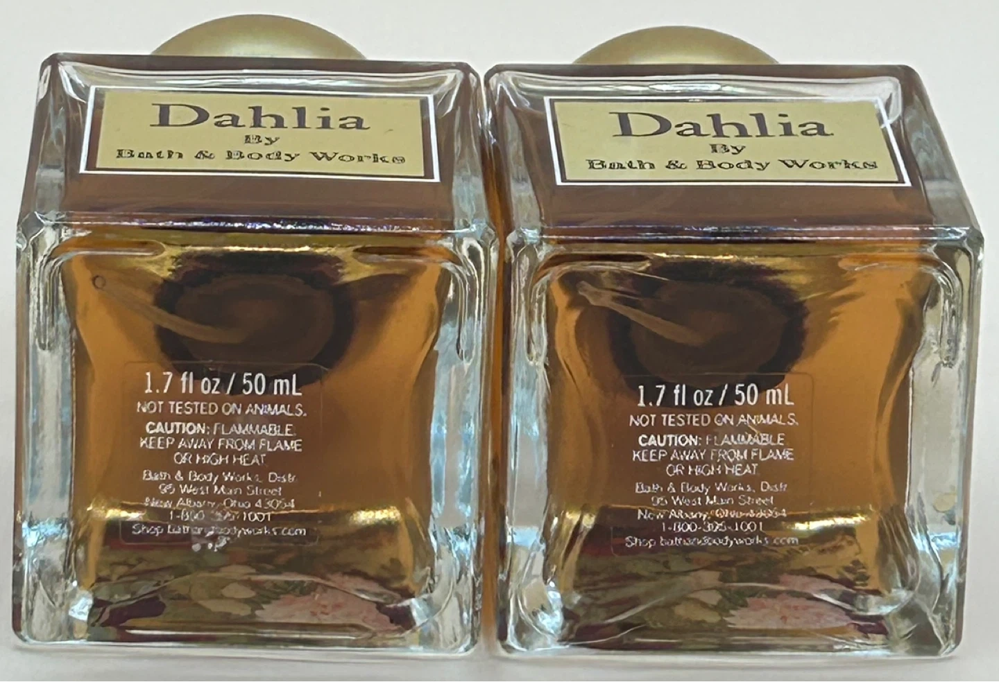 Two bottles of Dahlia perfume by Bath & Body Works. Each bottle contains 1.7 fl oz or 50 ml. Flammable, keep away from flame or high heat.