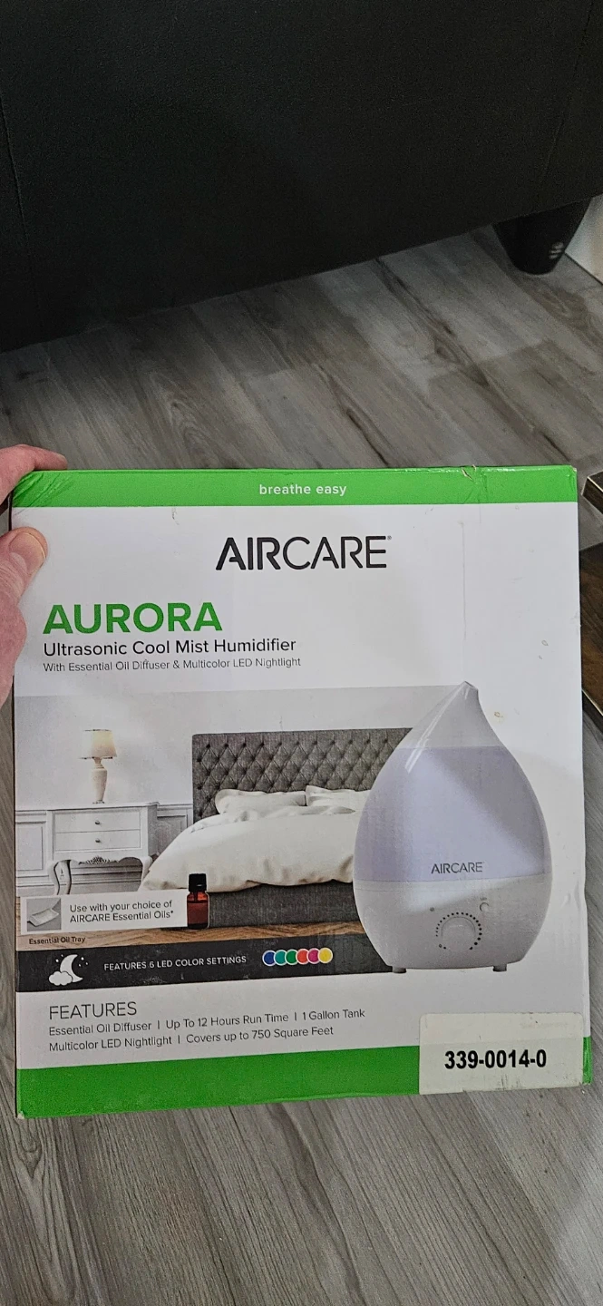 Selling an AIRCARE Aurora Ultrasonic Cool Mist Humidifier. It features an essential oil diffuser and multicolor LED nightlight. It has up to 12 hours of runtime, a 1-gallon tank, and covers up to 750 square feet. Comes with the box