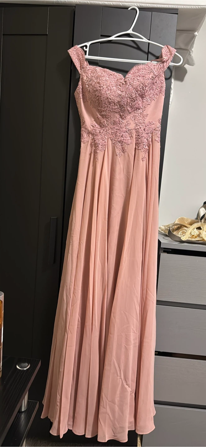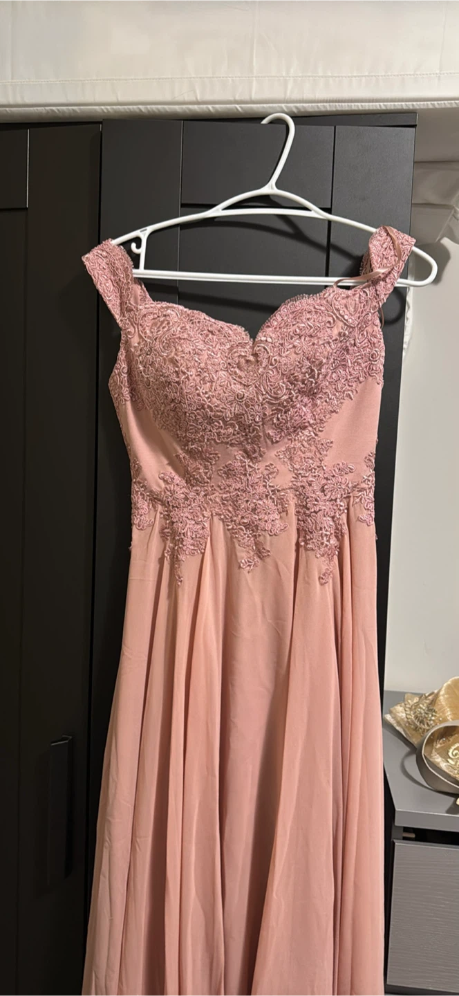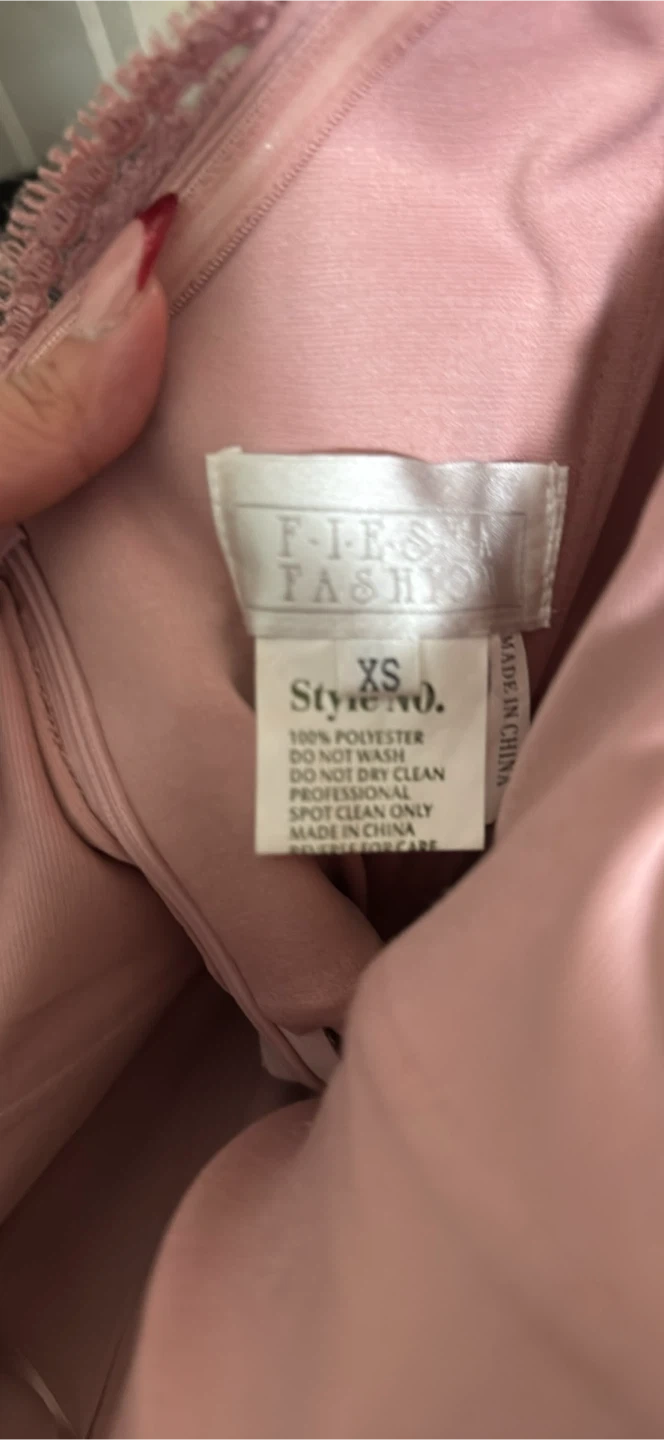 Beautiful pink maxi dress from Fiesta Fashion. It's a size XS with delicate lace appliqué on the bodice and cap sleeves. Made with 100% polyester, this dress requires spot cleaning only. It's perfect for a formal event or wedding!