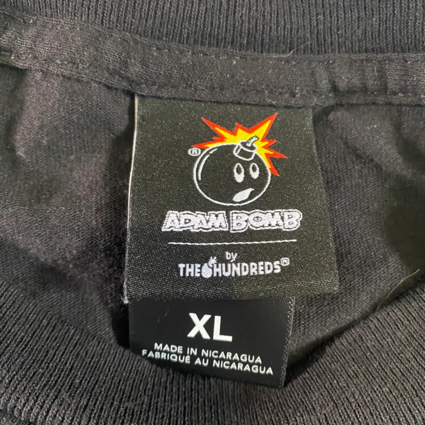 This is a black t-shirt by The Hundreds featuring the Adam Bomb graphic. It's size XL. It's a classic streetwear piece.