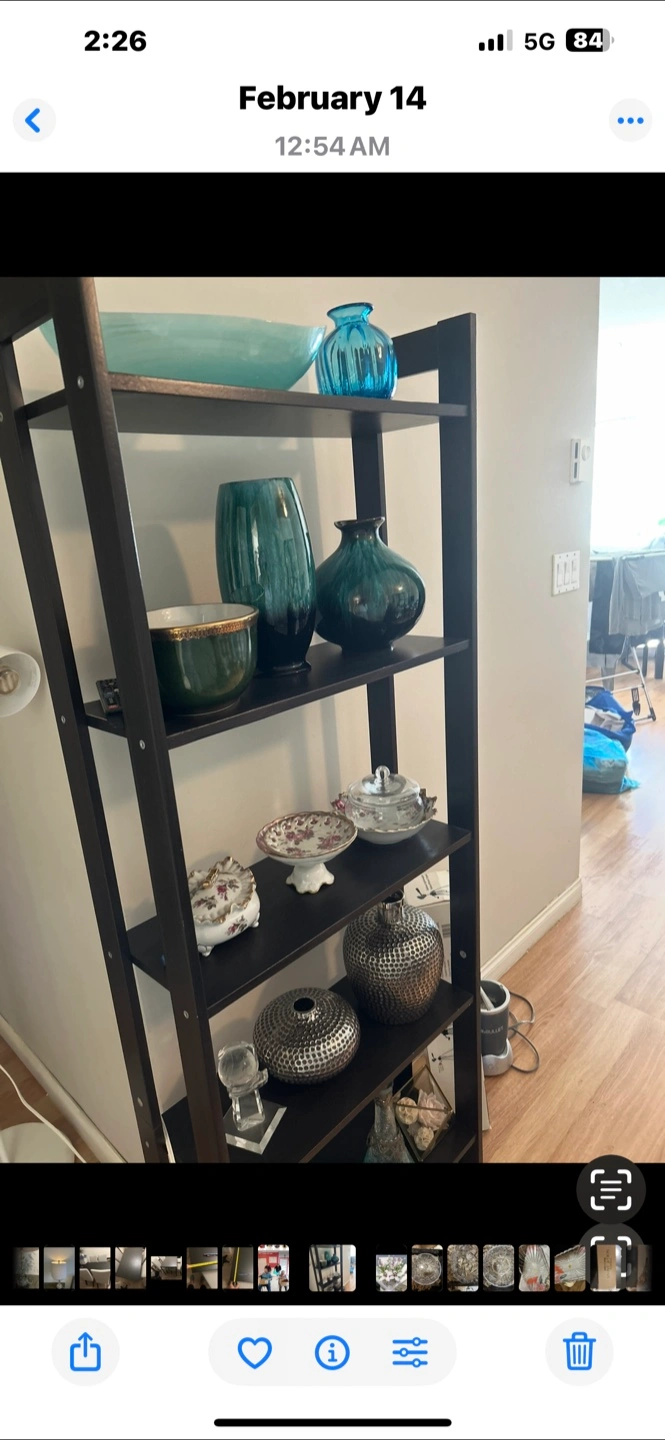 A dark wood leaning bookshelf with five shelves. It's perfect for displaying decor and storing books. Adds a stylish touch to any room!