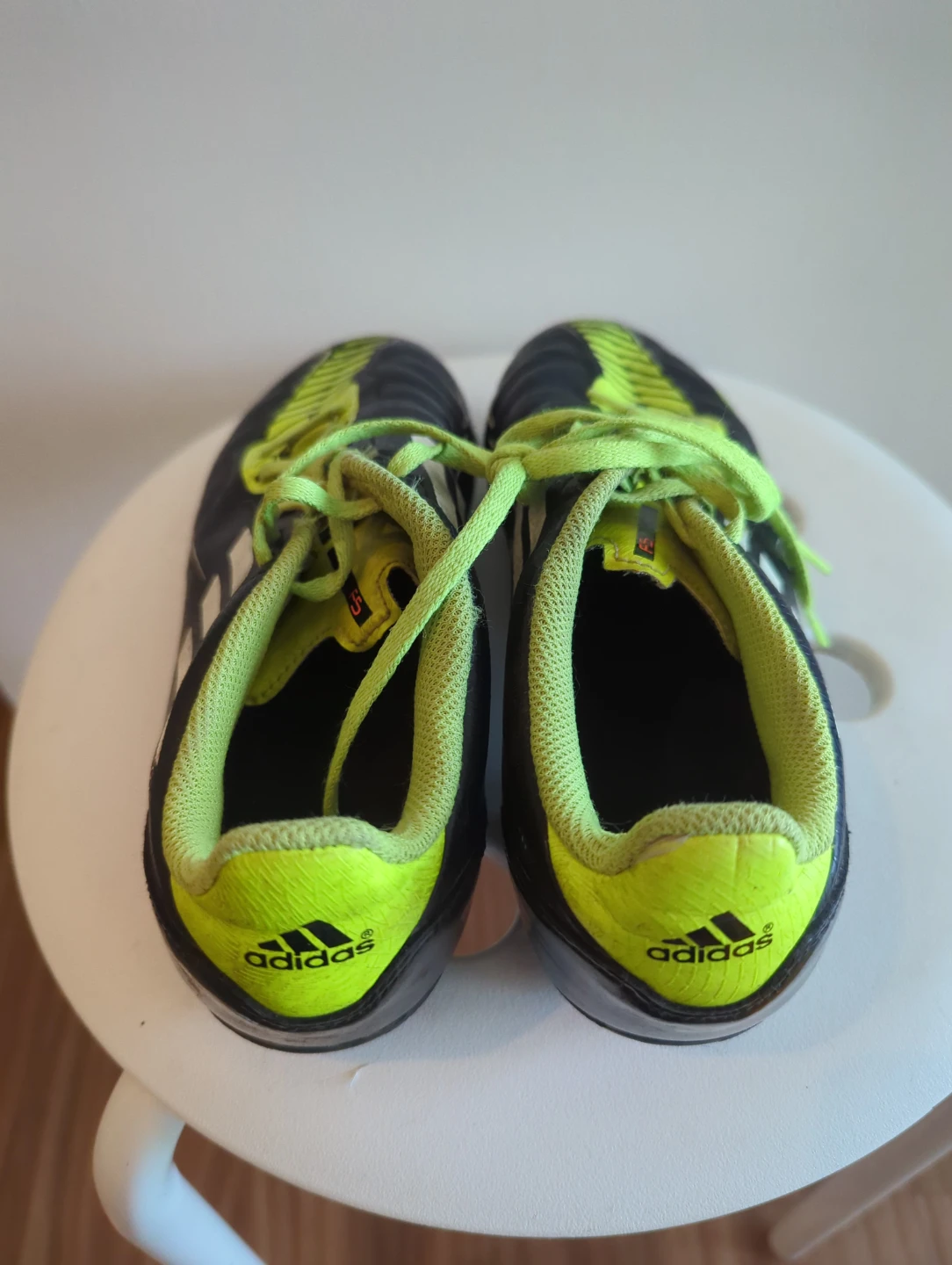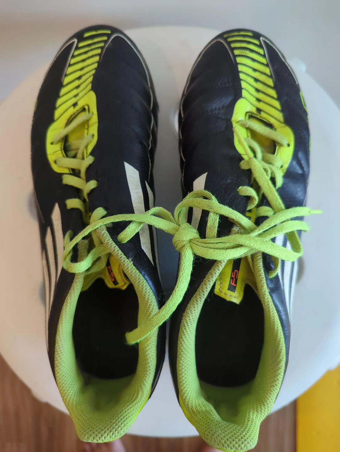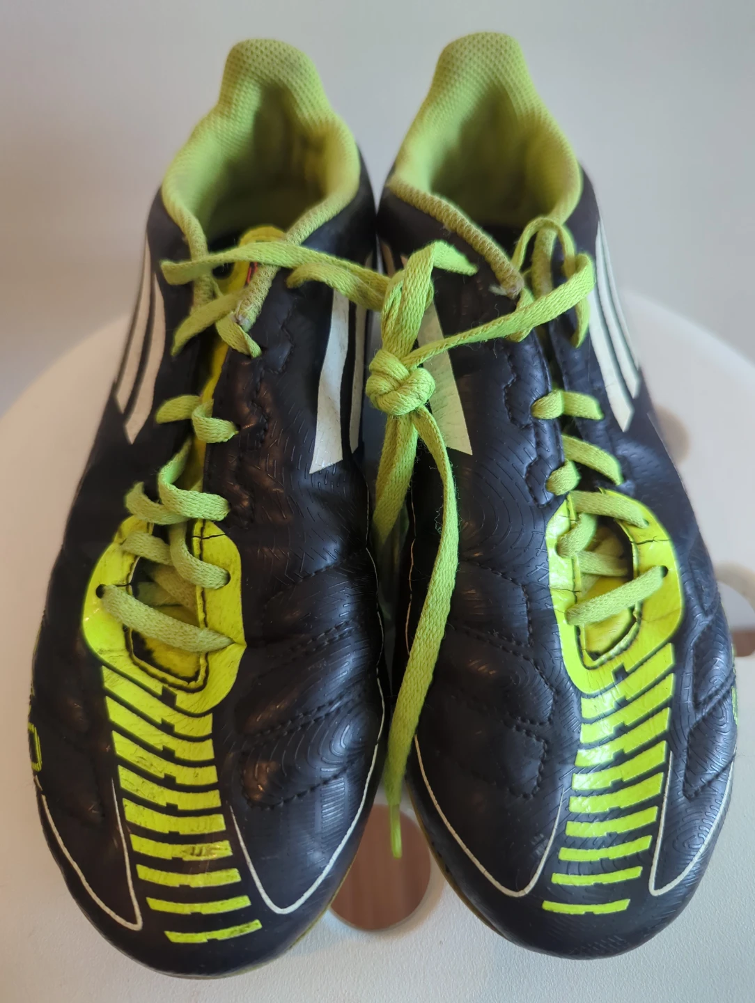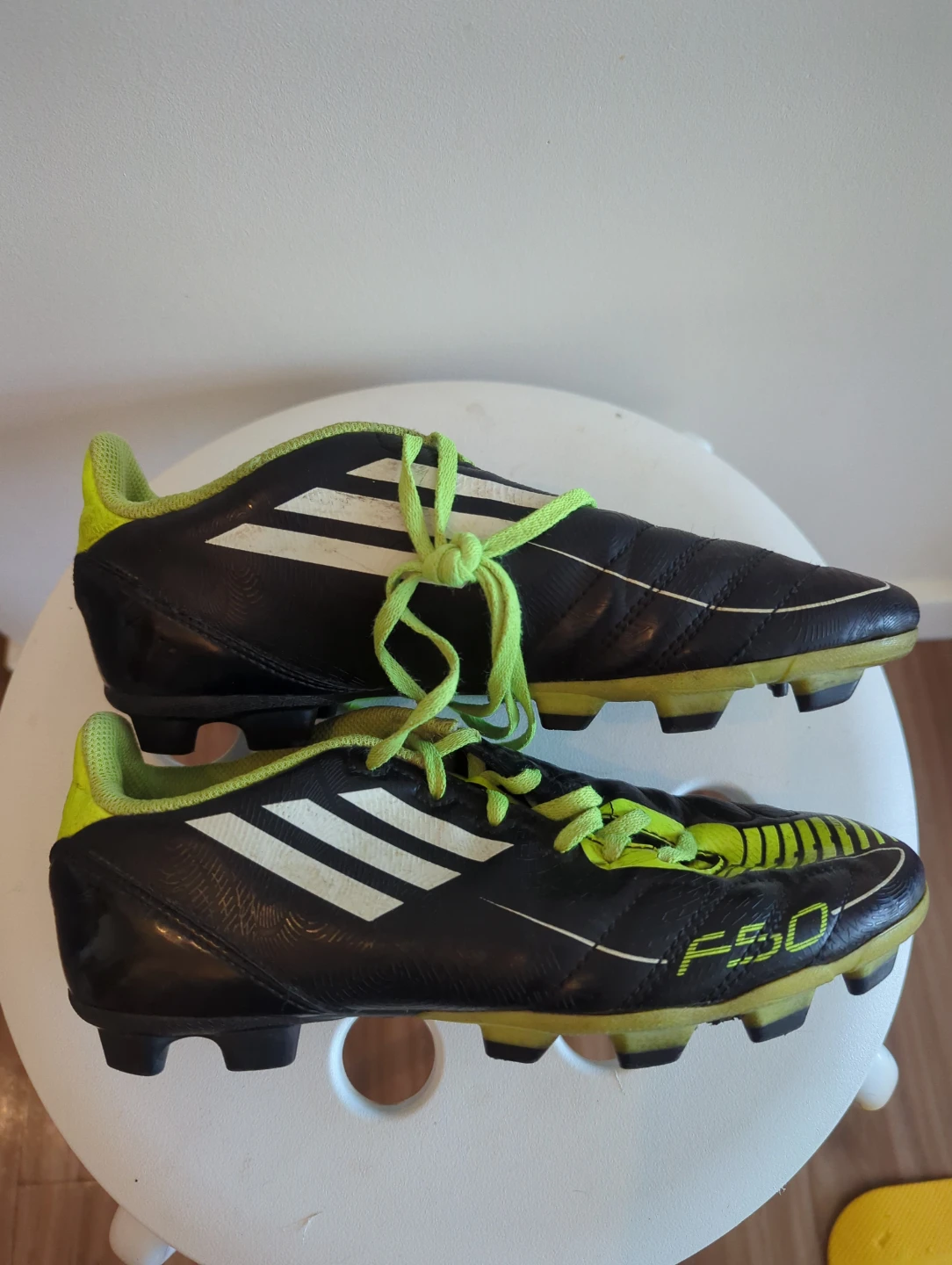 Black and neon green Adidas F50 soccer cleats. These cleats are designed for firm ground use. Good for playing soccer on grass or turf! Size US 4