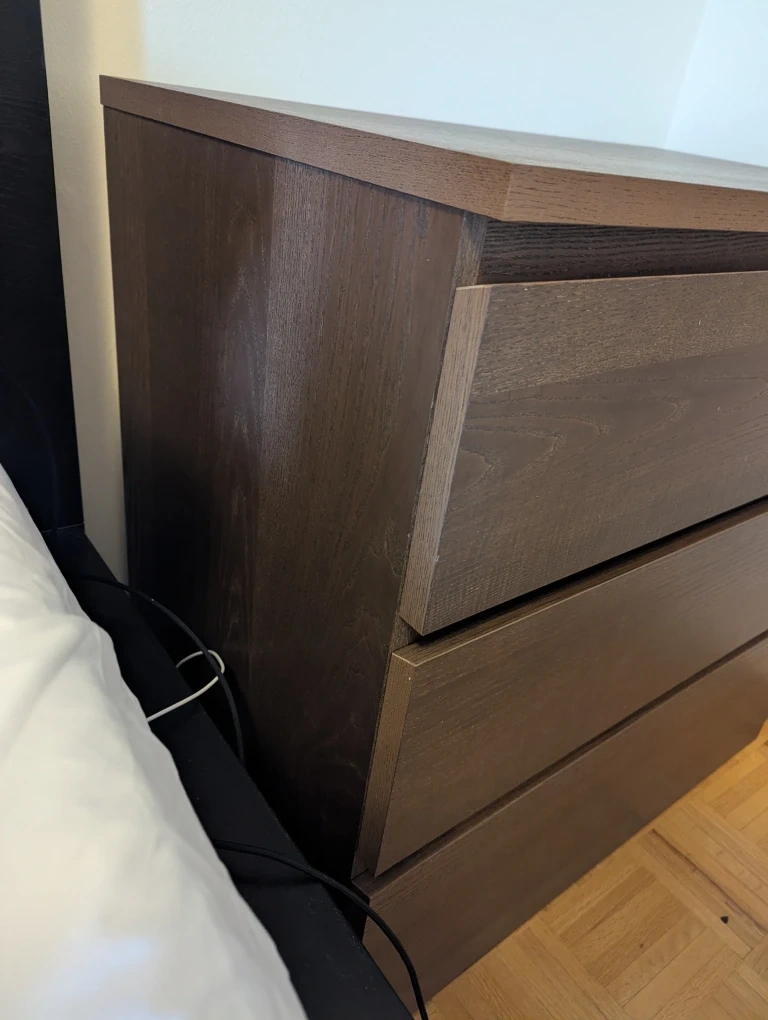 Selling a gently used IKEA 3-drawer chest in dark brown. It's in great shape and perfect for adding storage to any room. The Hemnes series is known for its classic style and durability, so it's sure to last!