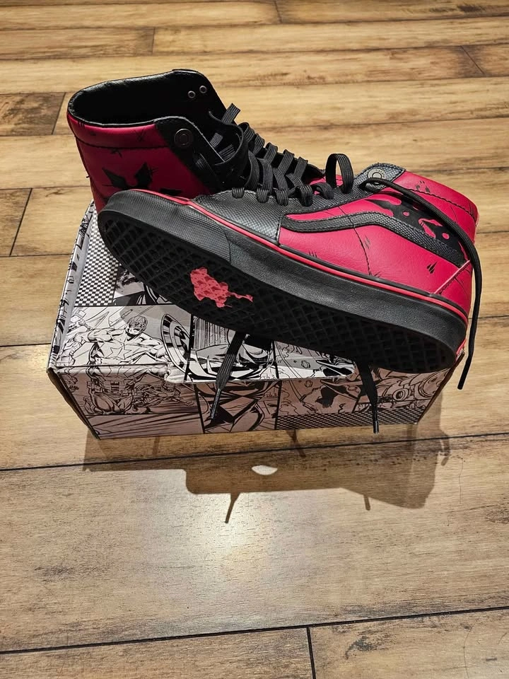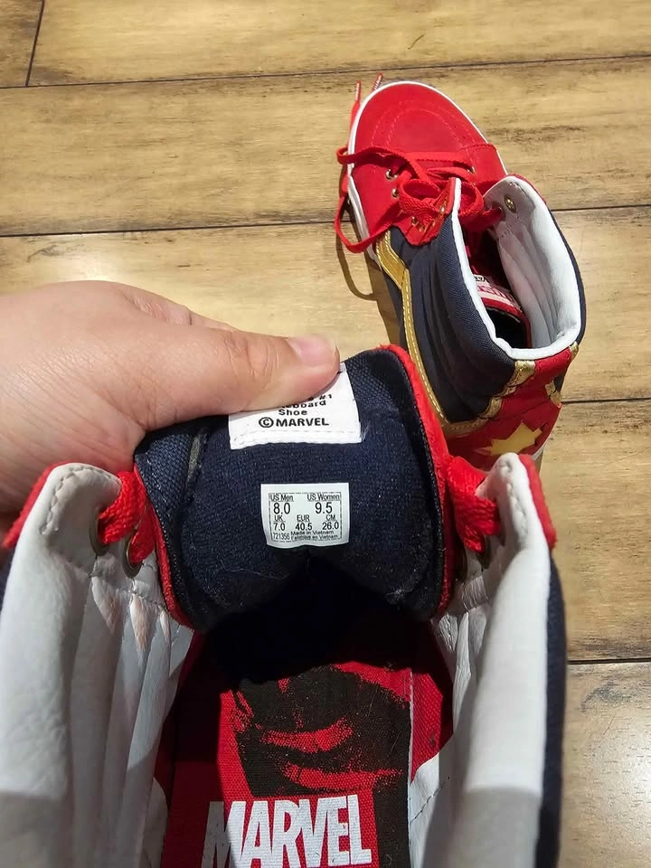 Deadpool Vans, used twice, still new, Size 9 women's, comes with the box. Captain Marvel Vans, never used, 9.5 women's, comes with a shoe bag. $20 each. Cash Only. Marine Drive Station.