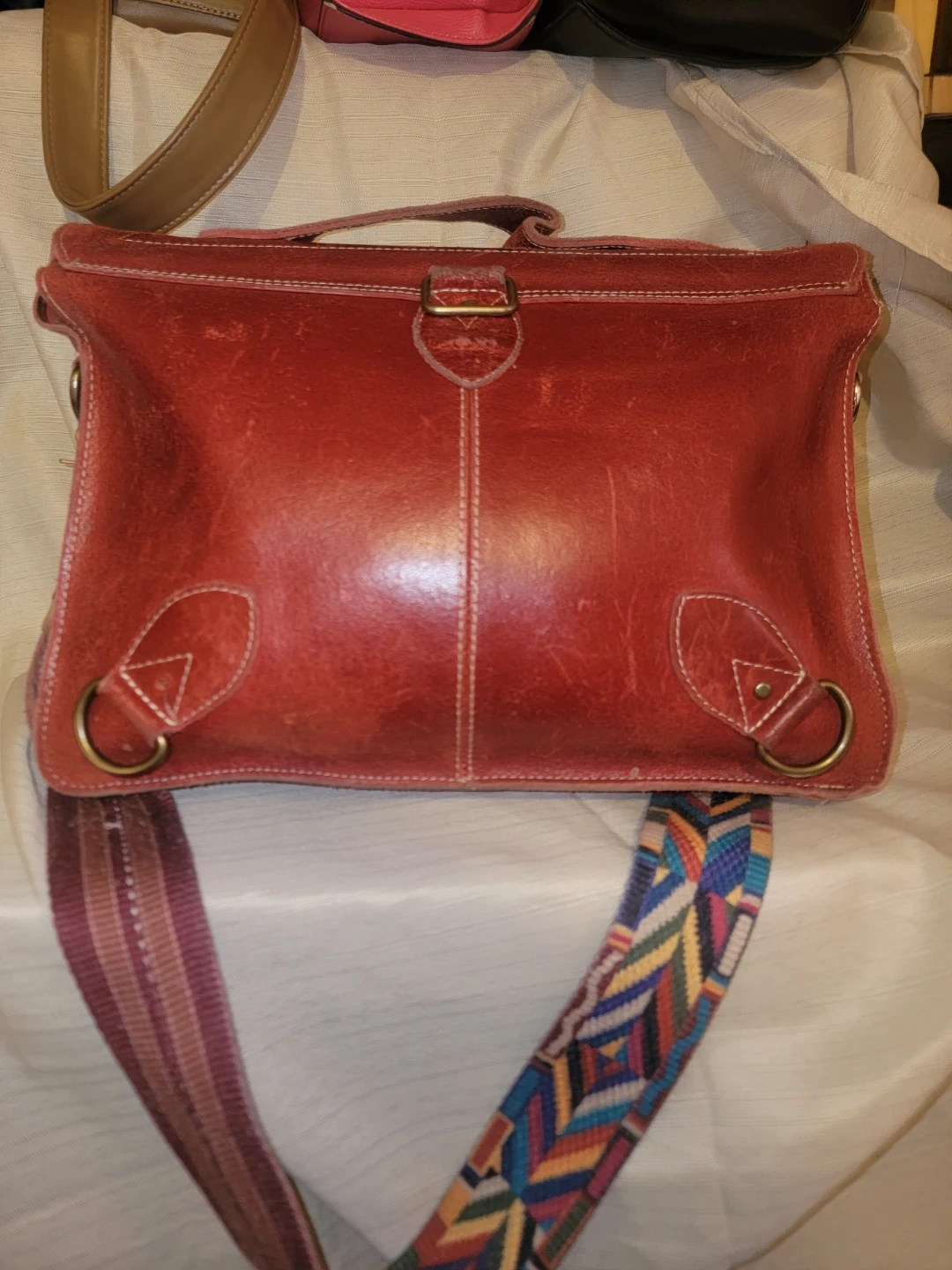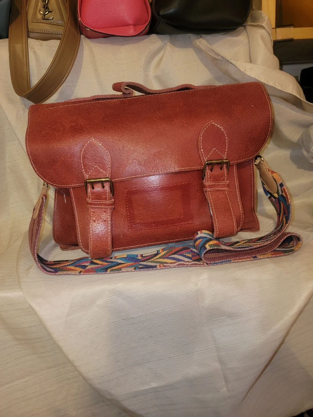This yo reinare satchel bag is made from genuine red leather. It features multiple compartments and an adjustable strap. It's a versatile bag for everyday use! Can also be used as a backpack. Handmade by designer of quality leather