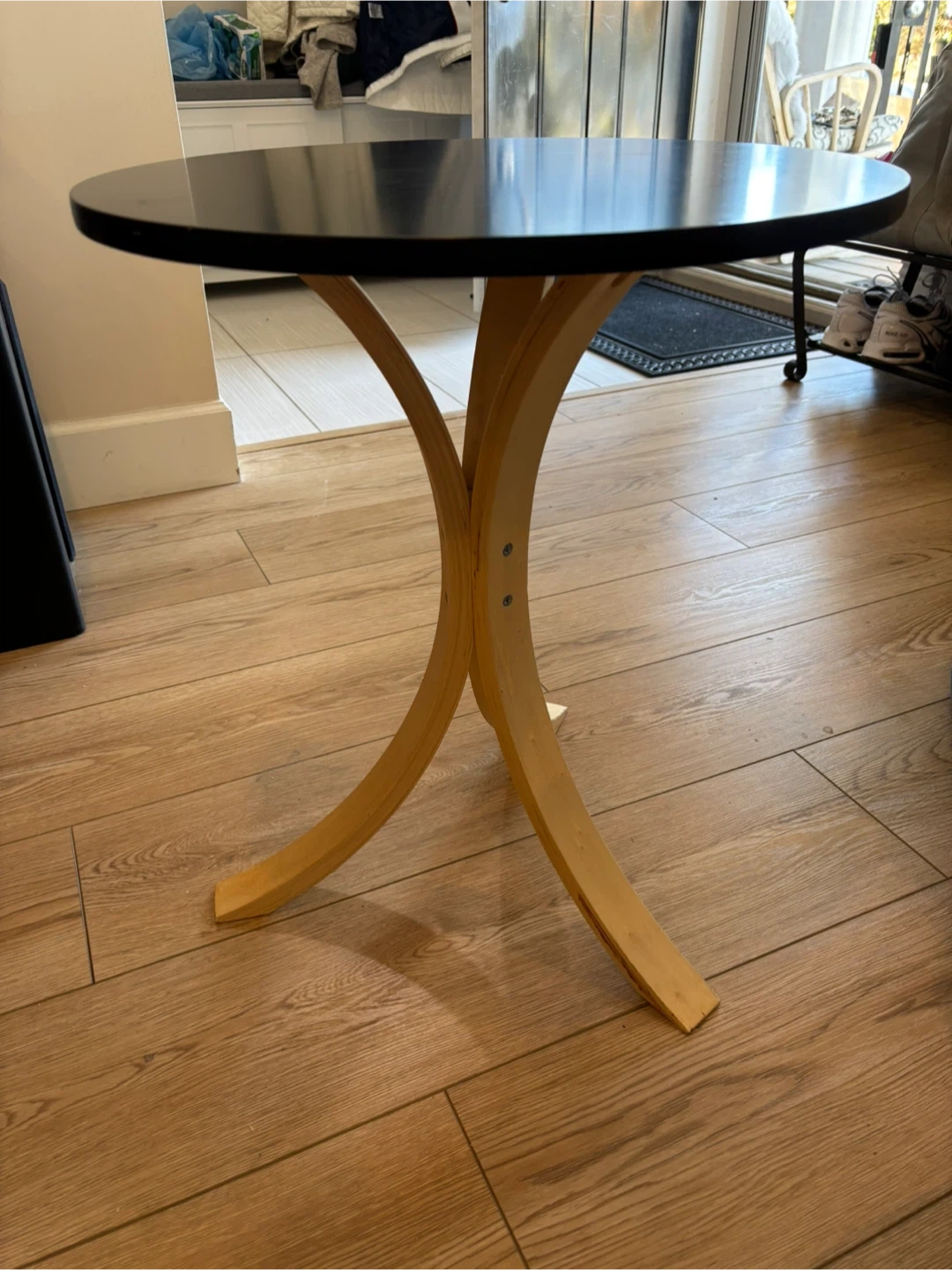 This is a black, round-top side table with a unique wooden base. It's a handy size for placing beside a couch or chair. The curved wooden legs give it a stylish look.