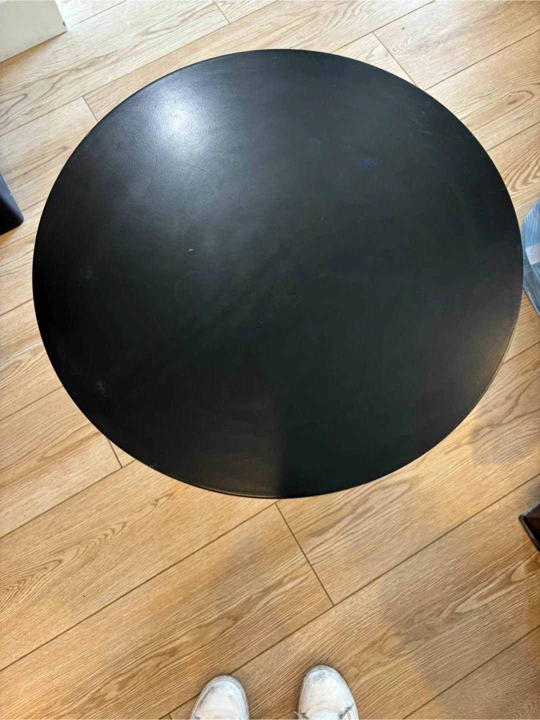 This is a black, round-top side table with a unique wooden base. It's a handy size for placing beside a couch or chair. The curved wooden legs give it a stylish look.