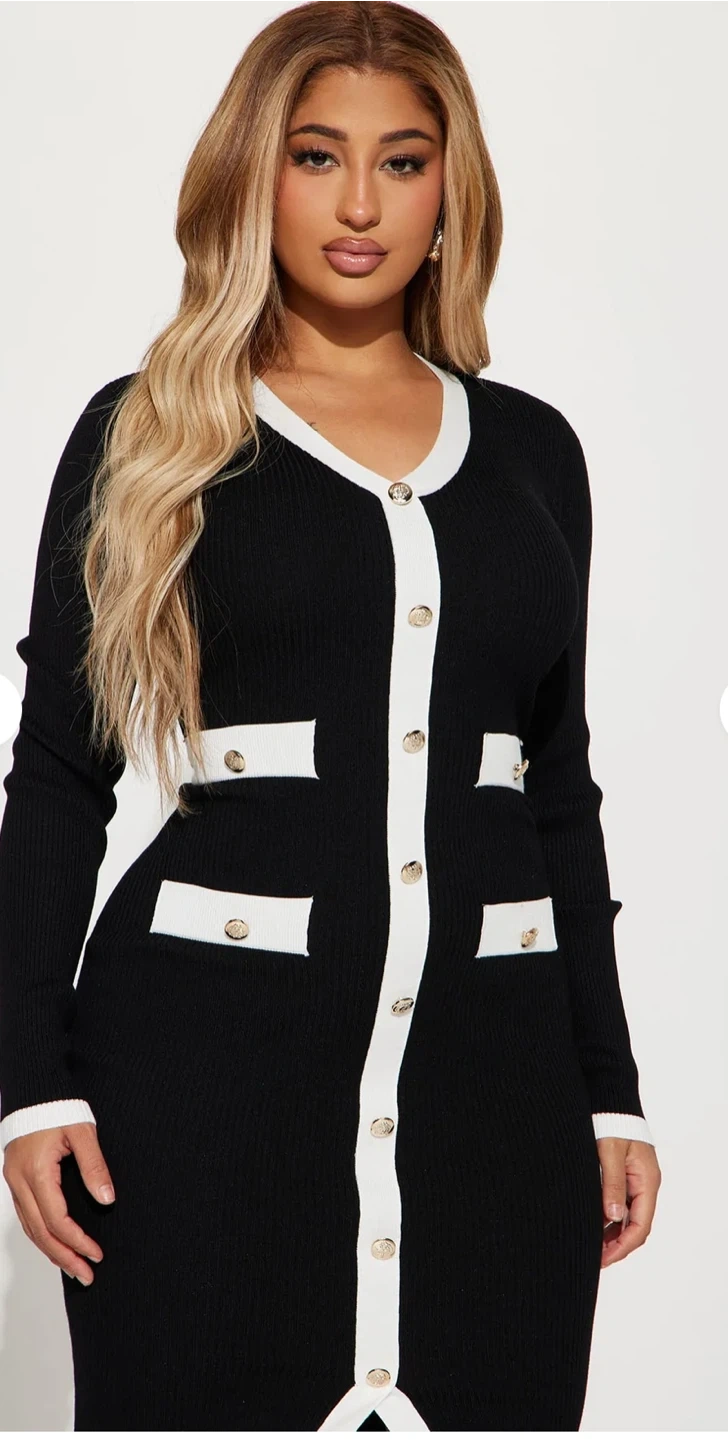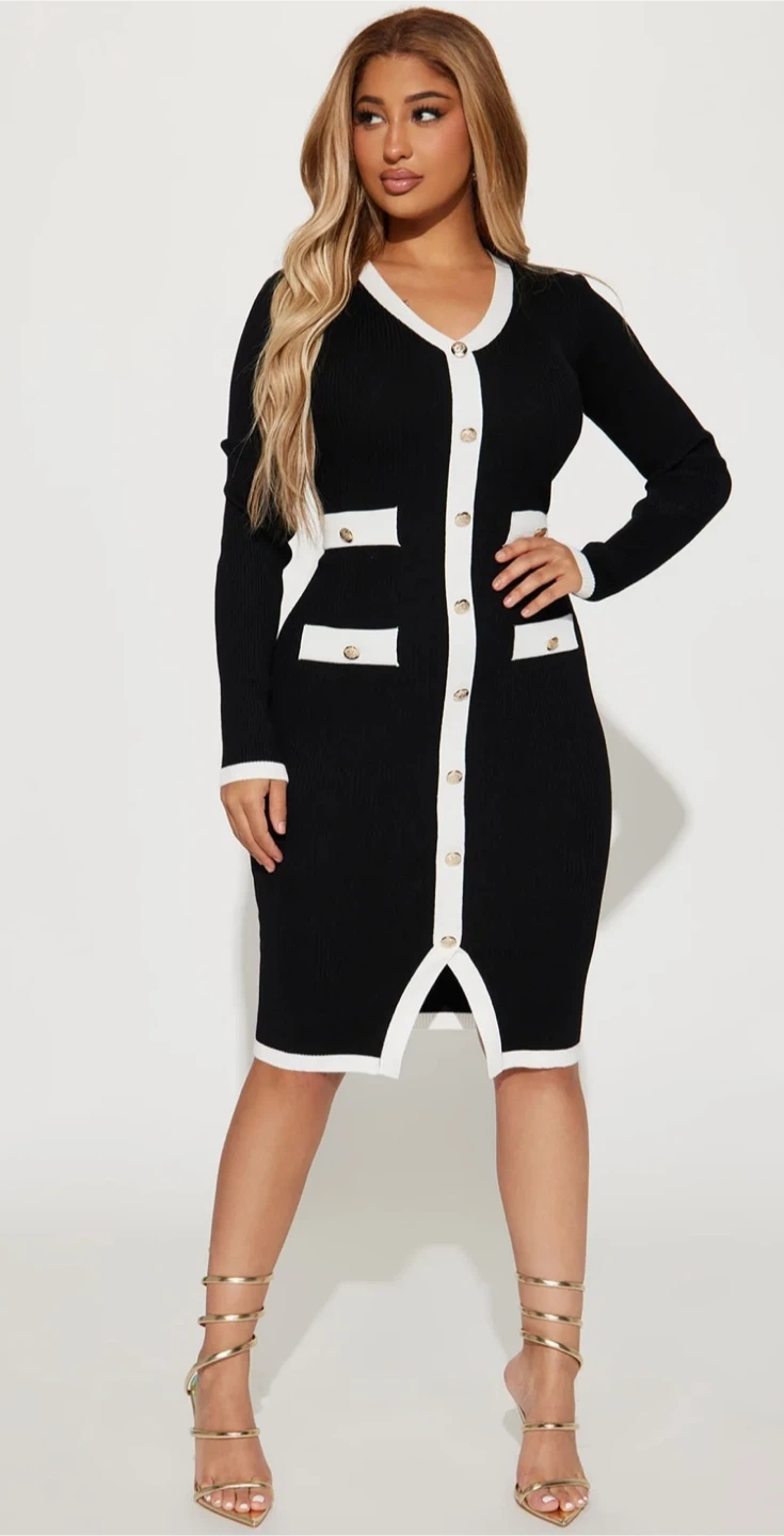 A chic black knit dress with contrasting white trim and gold button details. It's a long-sleeved, v-neck style with decorative pockets. This dress offers a flattering silhouette.