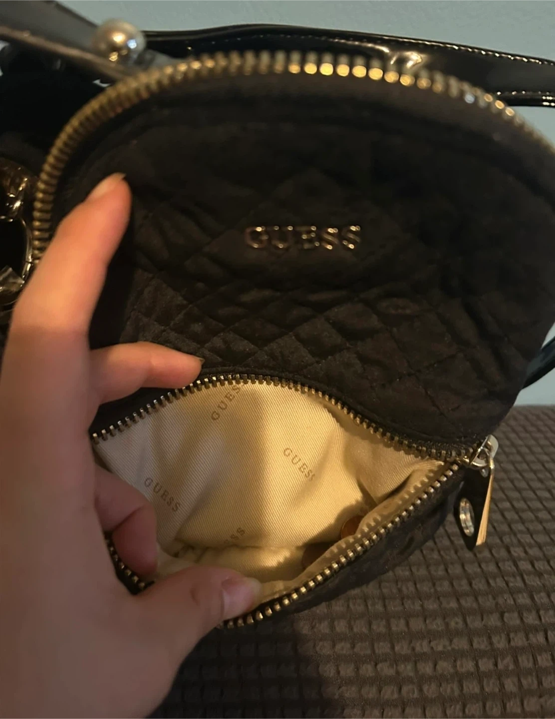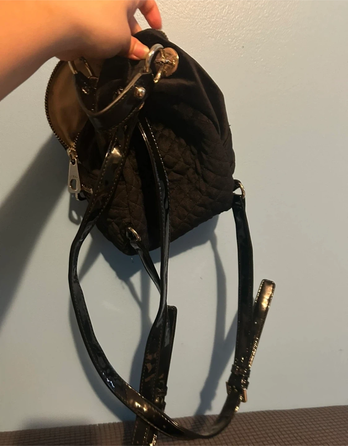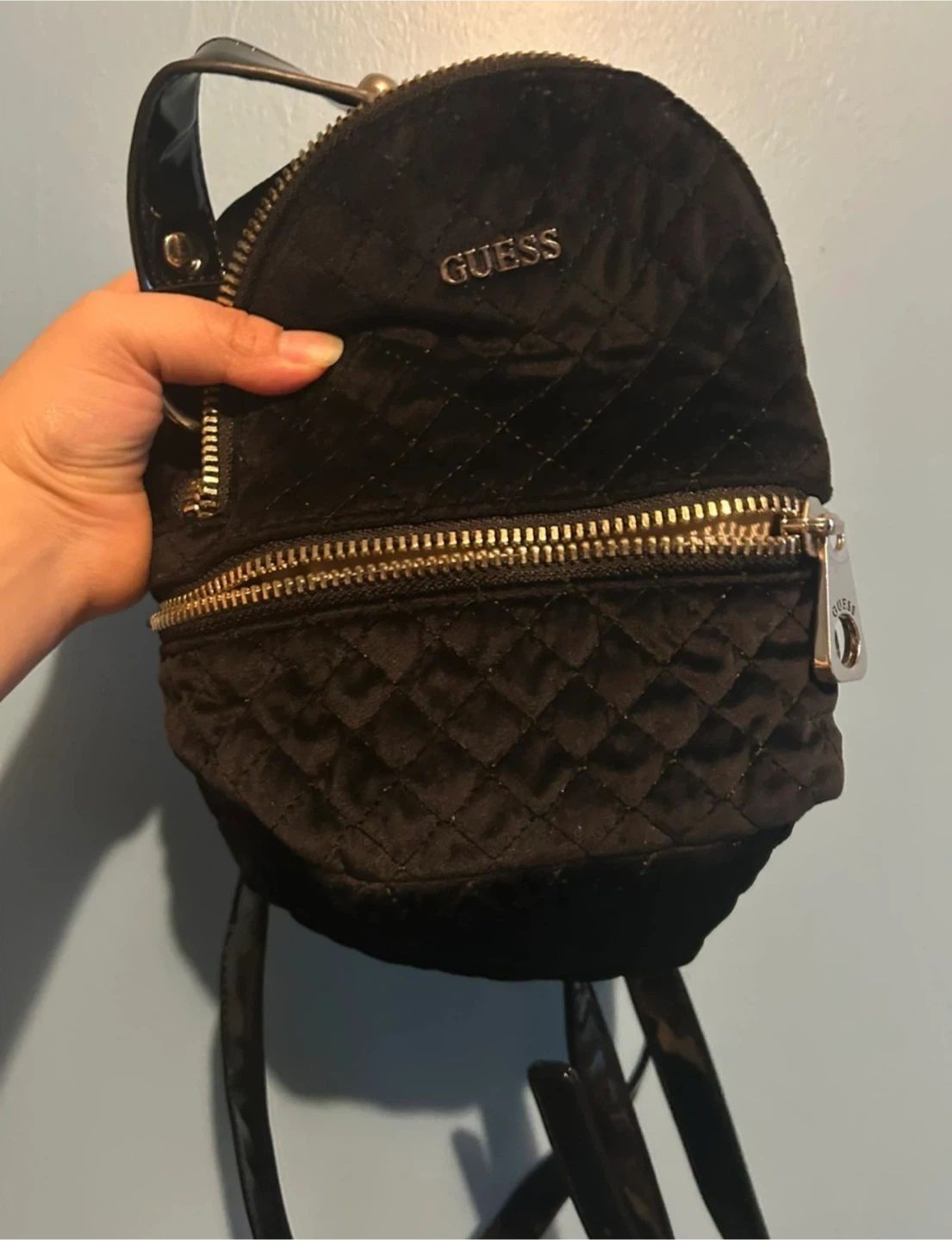 This black Guess mini backpack features a quilted velvet exterior with patent leather trim. It's got a main zippered compartment and a smaller front zippered pocket. Adjustable shoulder straps.