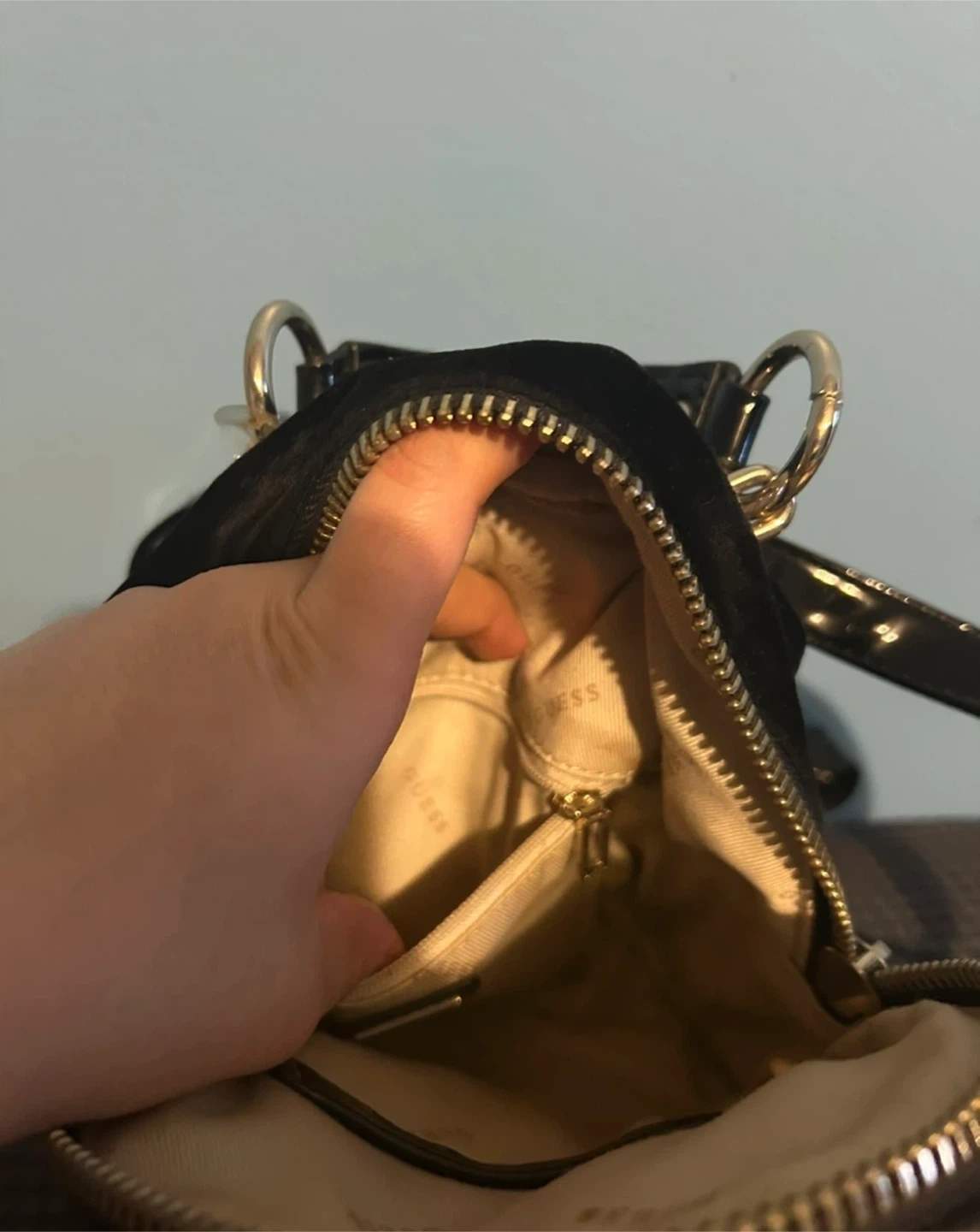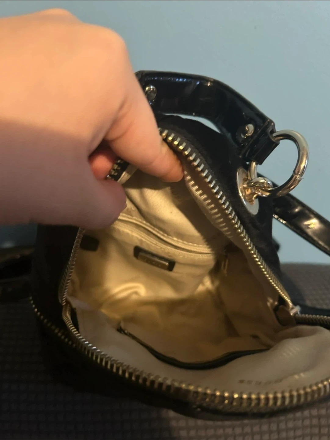 This black Guess mini backpack features a quilted velvet exterior with patent leather trim. It's got a main zippered compartment and a smaller front zippered pocket. Adjustable shoulder straps.
