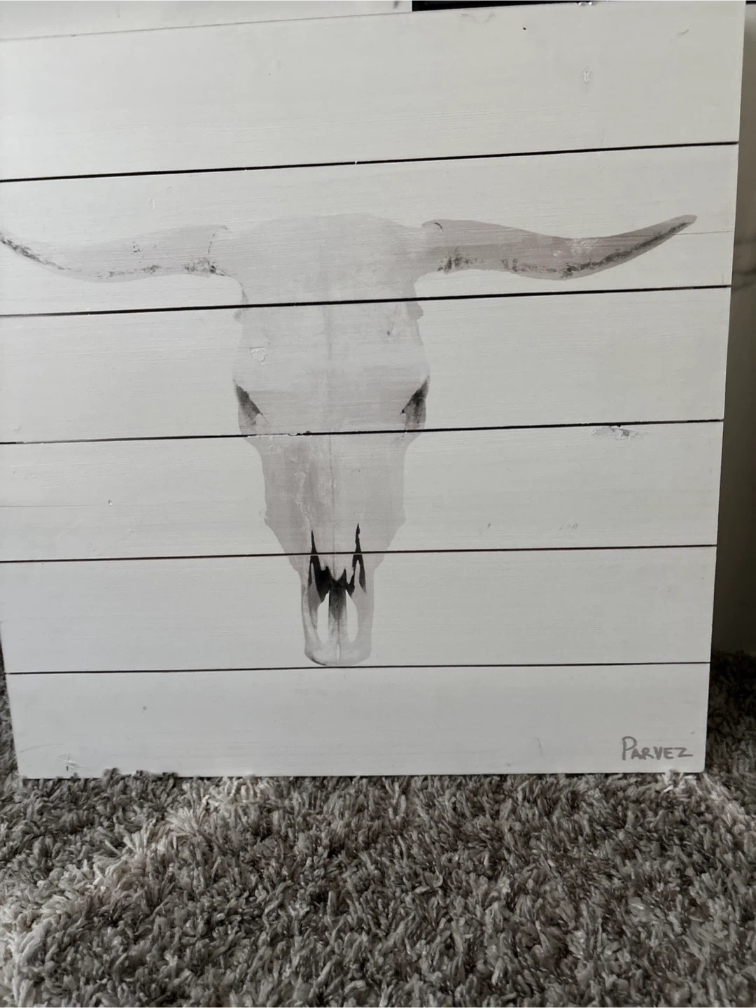 A rustic Parvez Taj wall art piece featuring a bull skull design. It's a unique and eye-catching decor item for any room it is wooden white cow picture