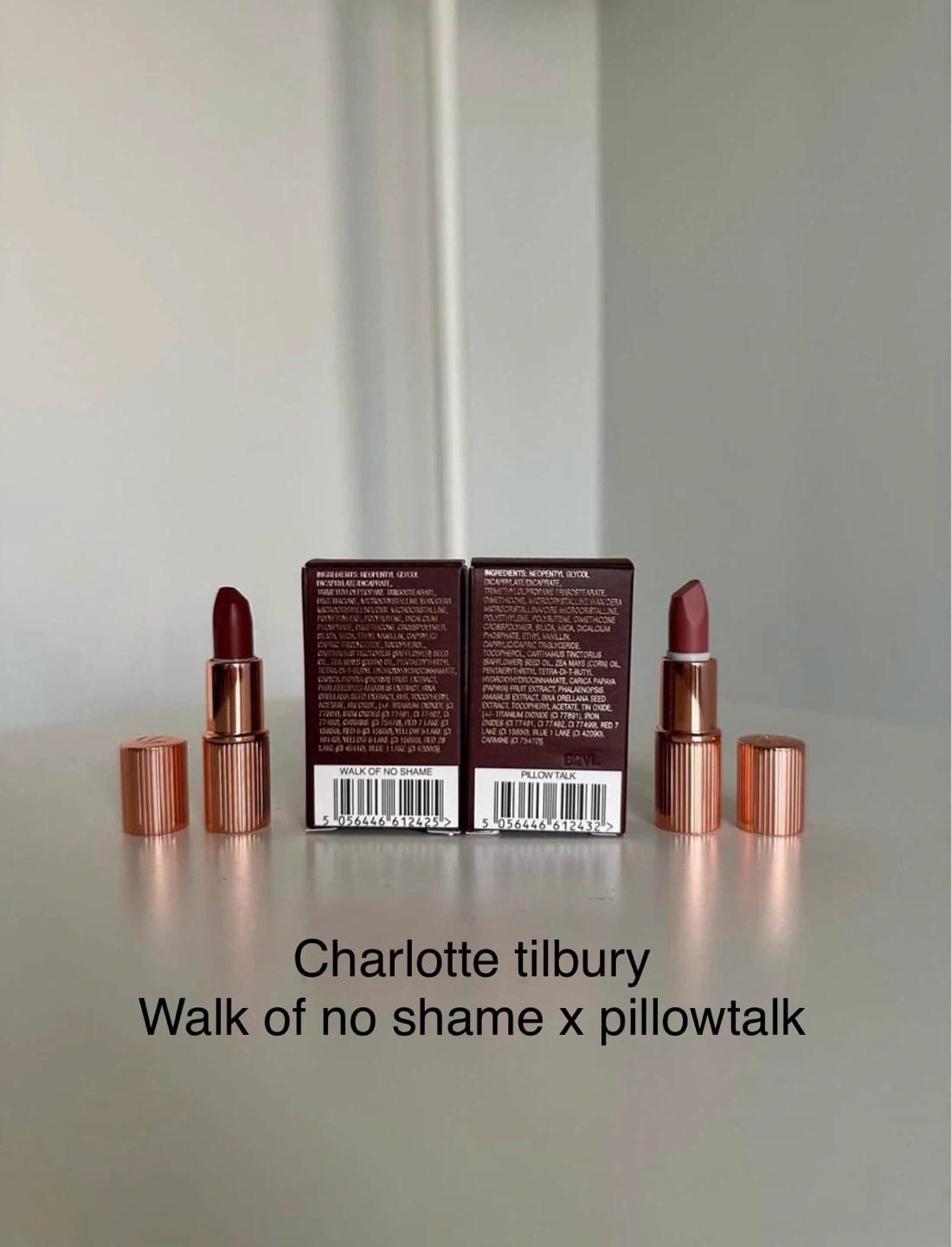 Two mini Matte Revolution lipsticks from Charlotte Tilbury in the shades 'Walk of No Shame' and 'Pillow Talk'. Each lipstick is 1.1g (0.03 oz).
