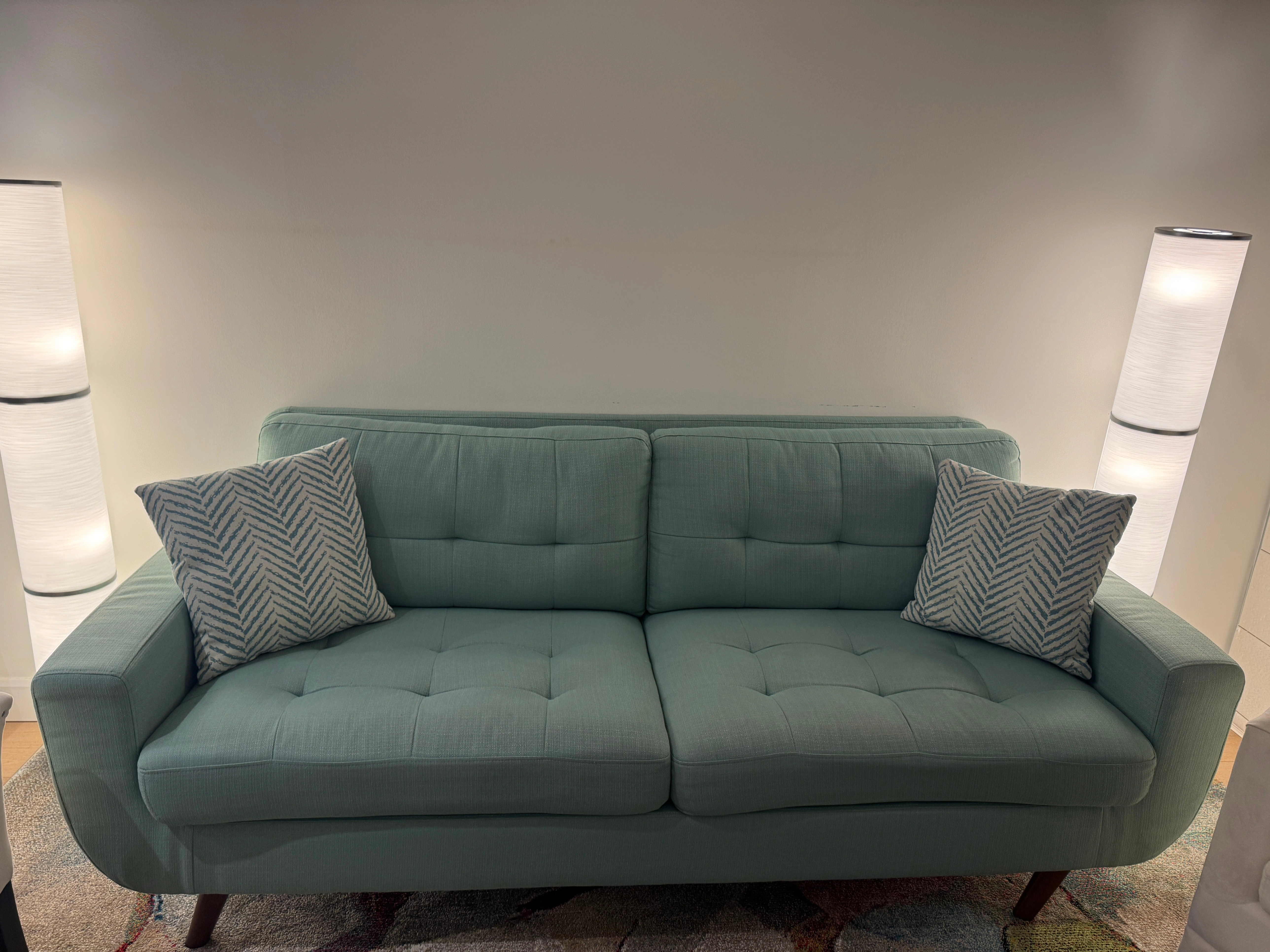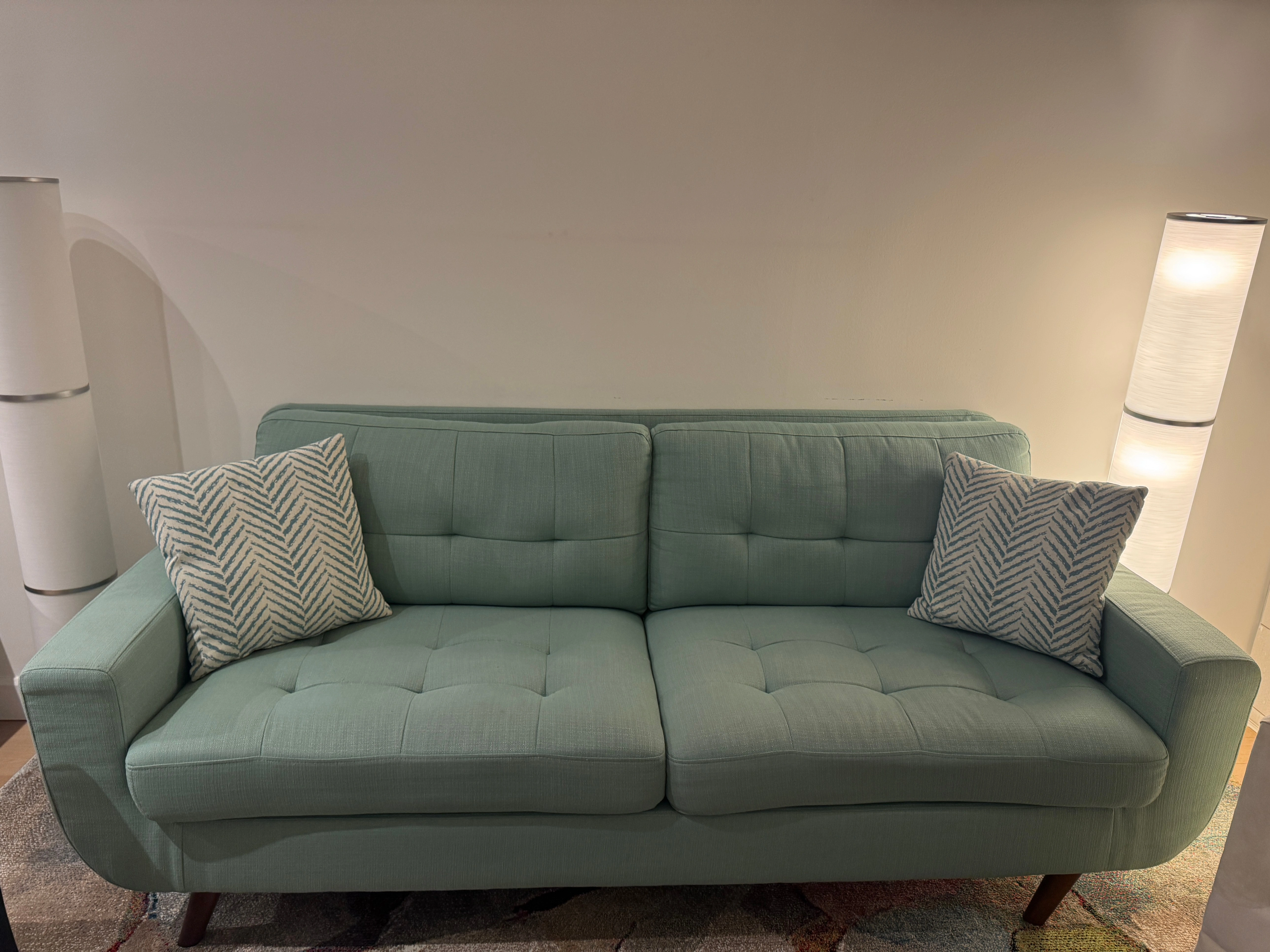 Stylish and comfortable 3-seater teal sofa with a mid-century modern vibe. Tufted back cushions, firm yet cozy seating, comes with two matching patterned throw pillows. Great condition, perfect for living room or apartment.