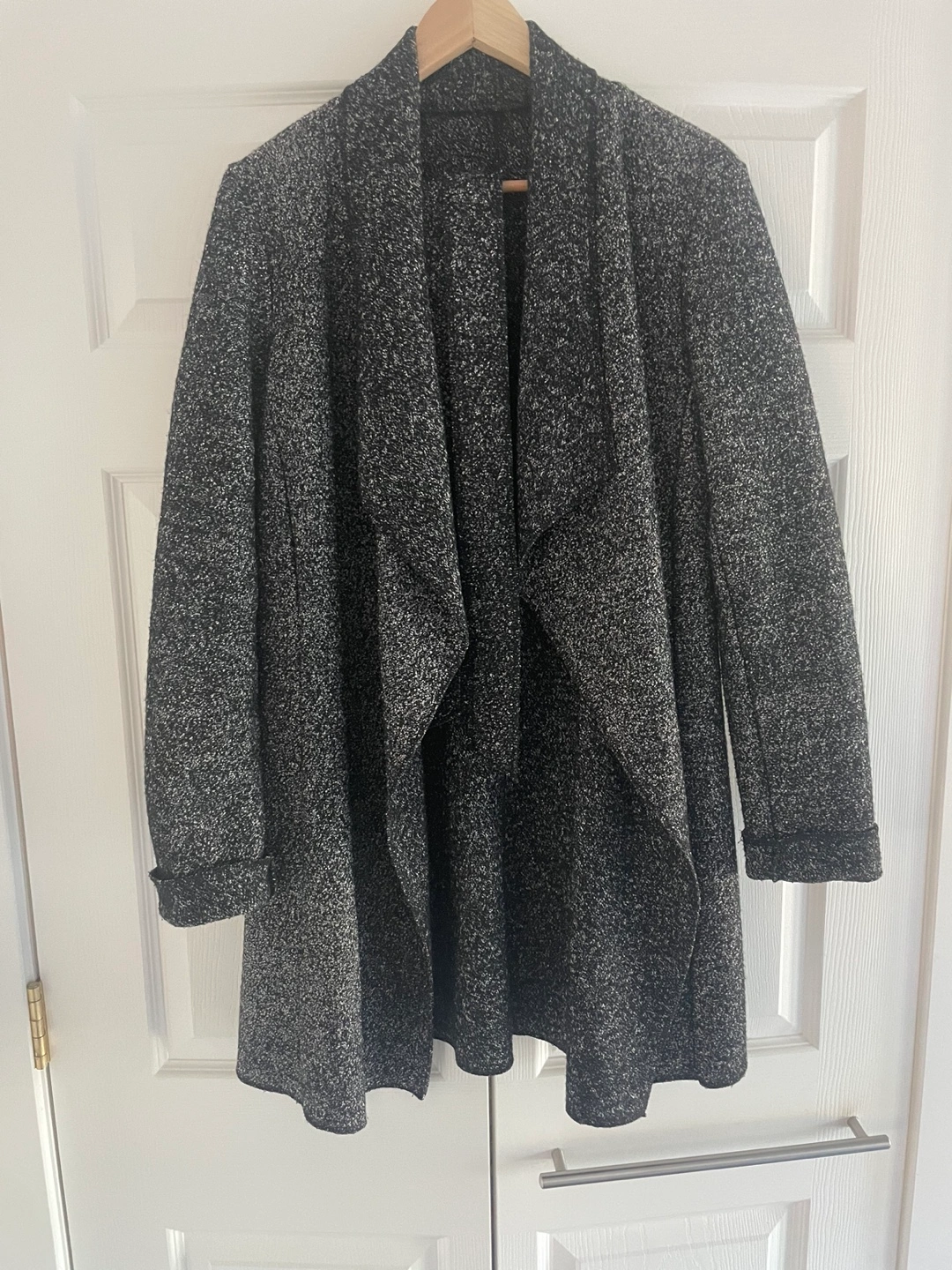 Long-sleeved cardigan with a draped front and a black and white pattern. The cardigan has a long, relaxed fit. The sleeves are long and fitted. The cardigan is made of a soft and comfortable fabric.