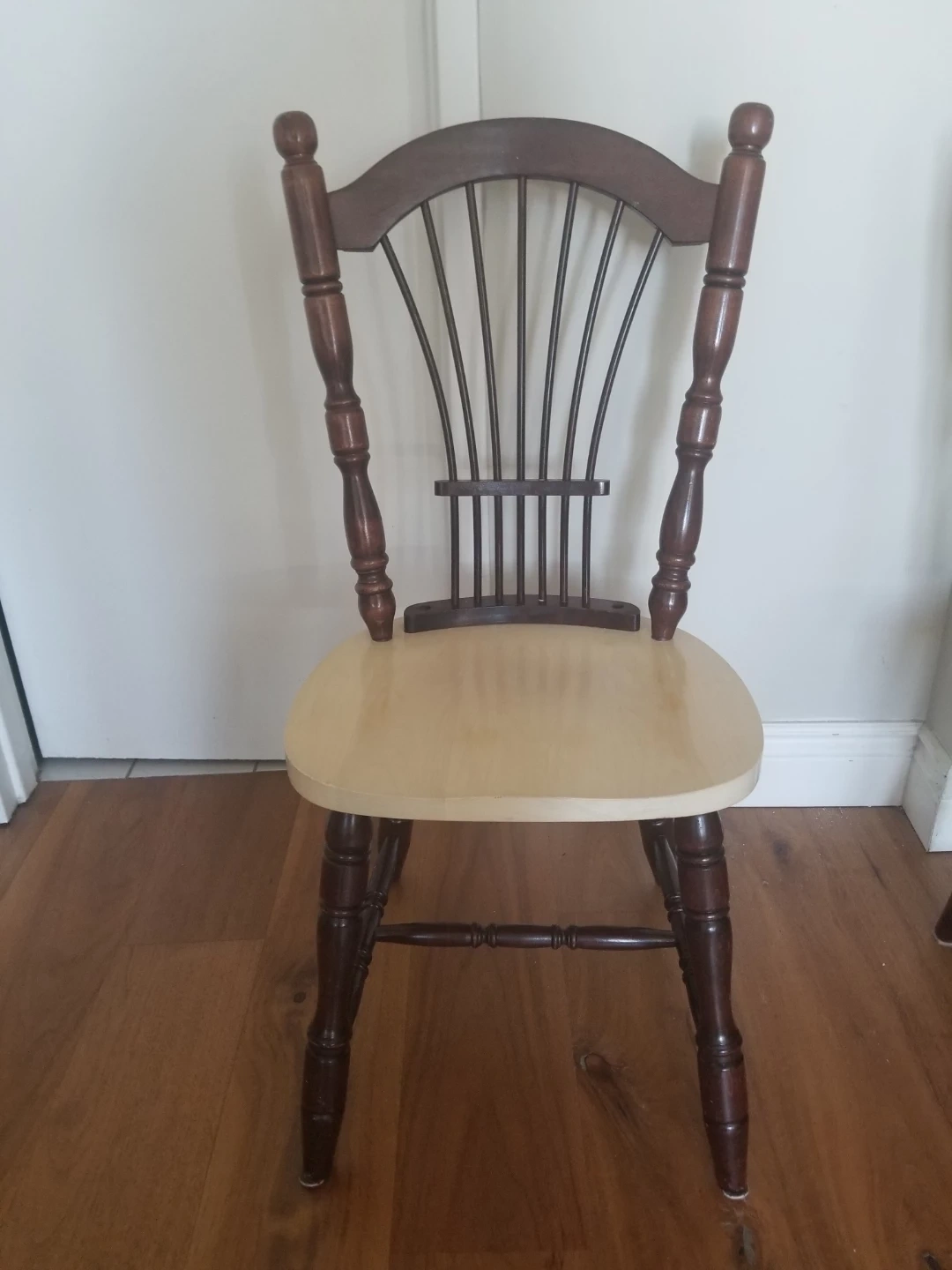 This elegant two-tone chair features a sturdy wooden frame with a contrasting seat, making it a stylish addition to any room. The chair is in excellent condition. It's perfect for adding a touch of classic charm to your dining area or study.