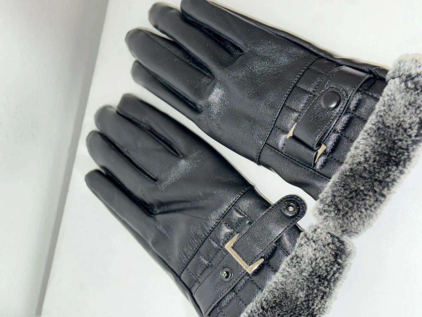 These black gloves are made from faux leather and feature a cozy grey fur lining. They have decorative buckle and snap closures at the wrist. Keep your hands warm and stylish this winter!